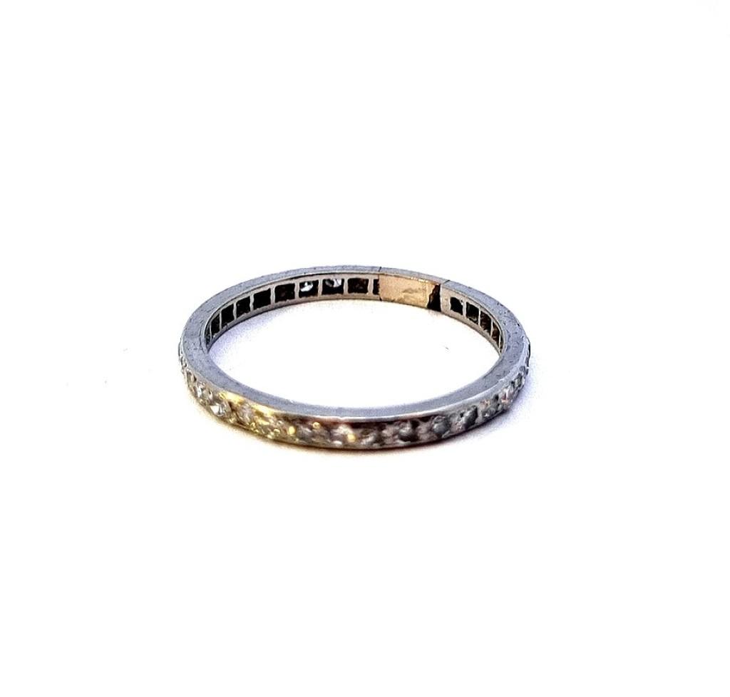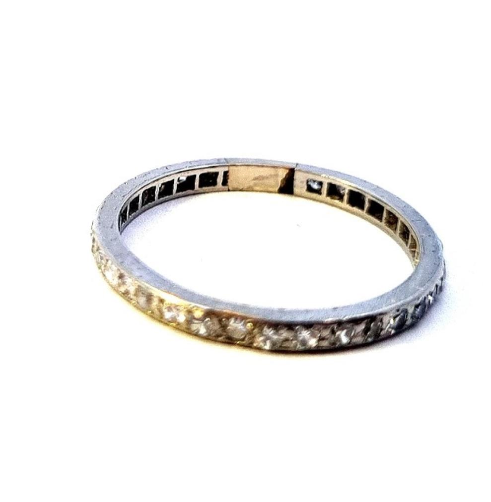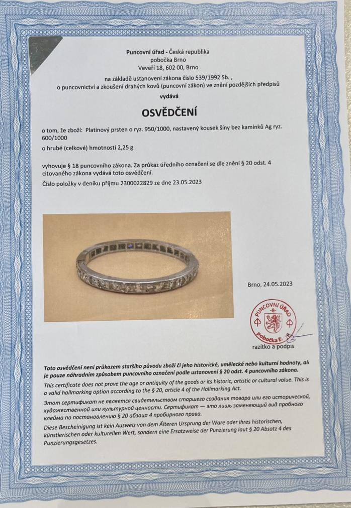 Platinový prsten o ryzosti 950/1000, nastavený kousek šíny bez kamínků - stříbro 600/1000, osvědčení z puncovního úřadu, váha 2,26 g, velikost 54, v nejširším bodě 2 mm, kámen - diamant briliantového brusu - celkem 32 ks, cca 0,6 ct.