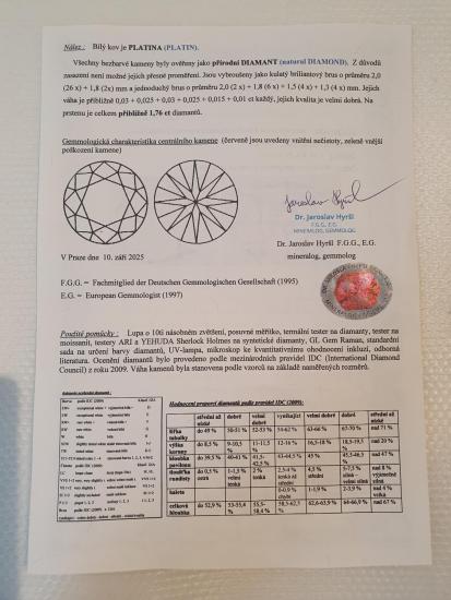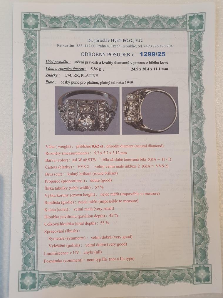 Platinový prsten o ryzosti 950/1000, punc český platný od r. 1949. Velikost 54, váha 5,86 g, v nejširším bodě 11 mm. Kameny viz. odborný posudek - přírodní diamanty celkem cca 1,76 ct.