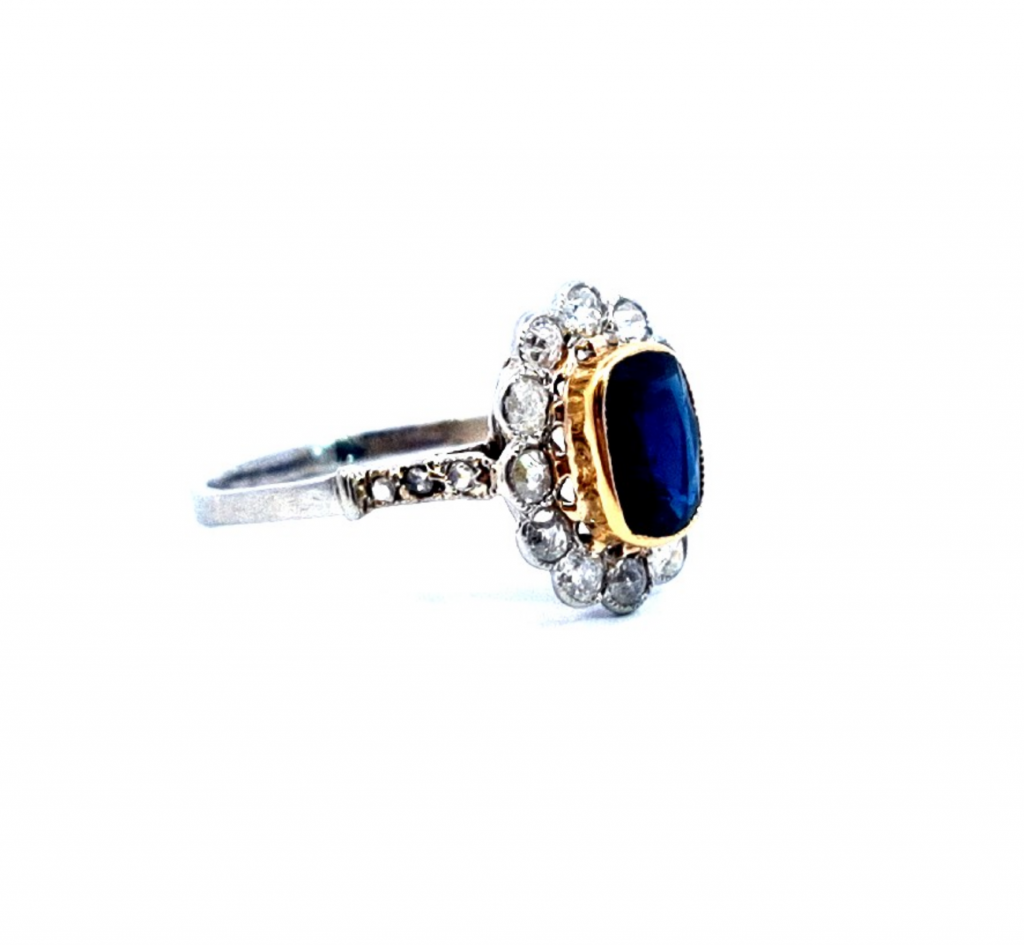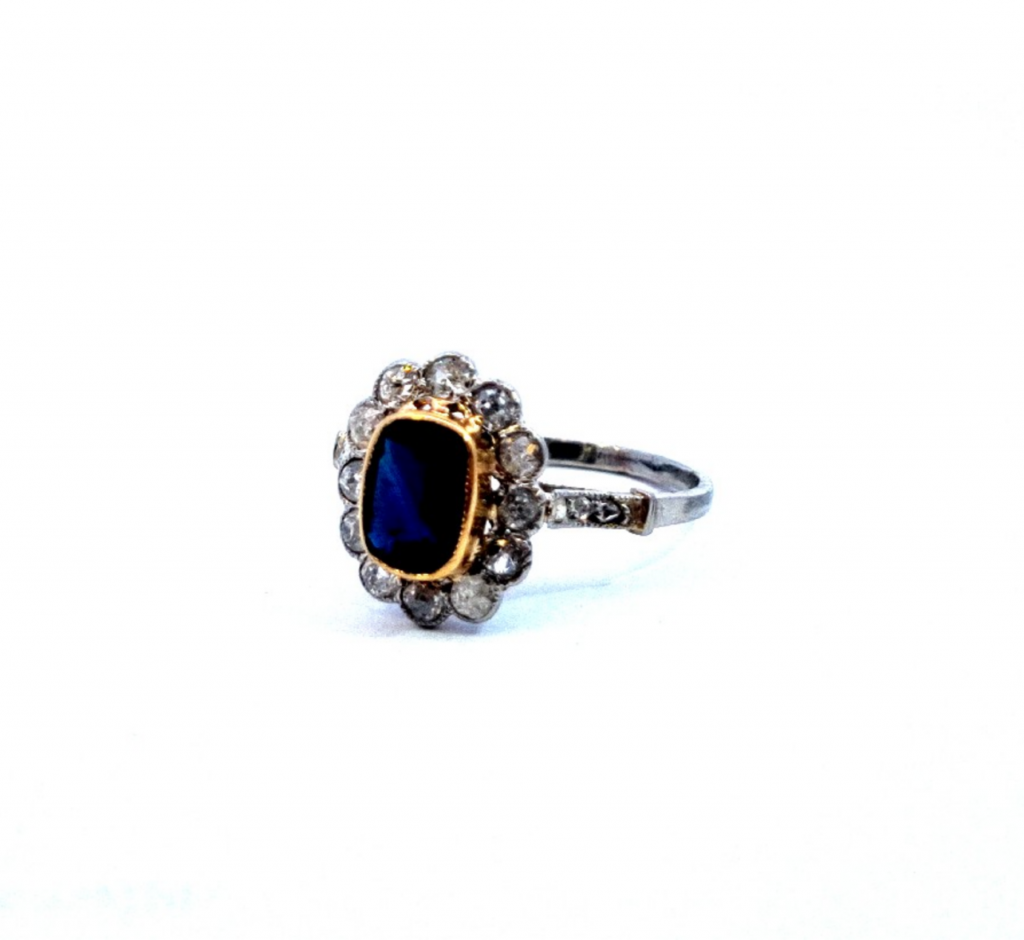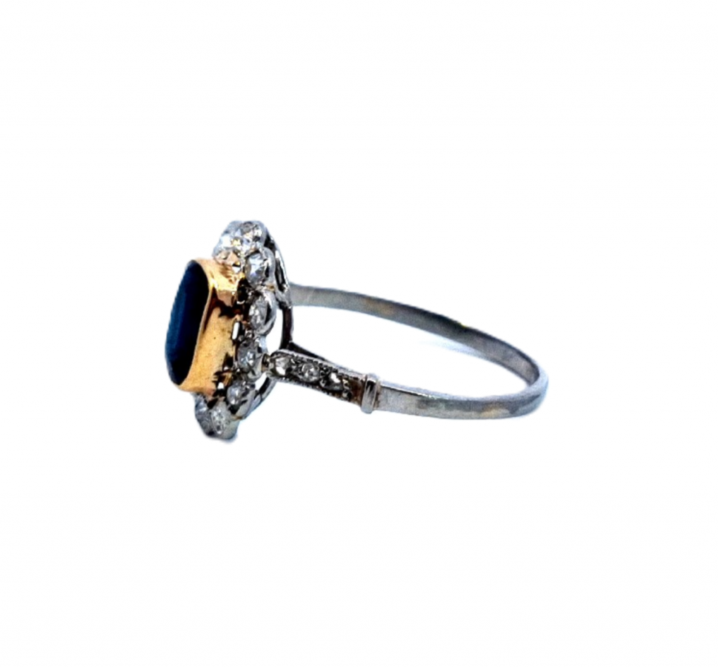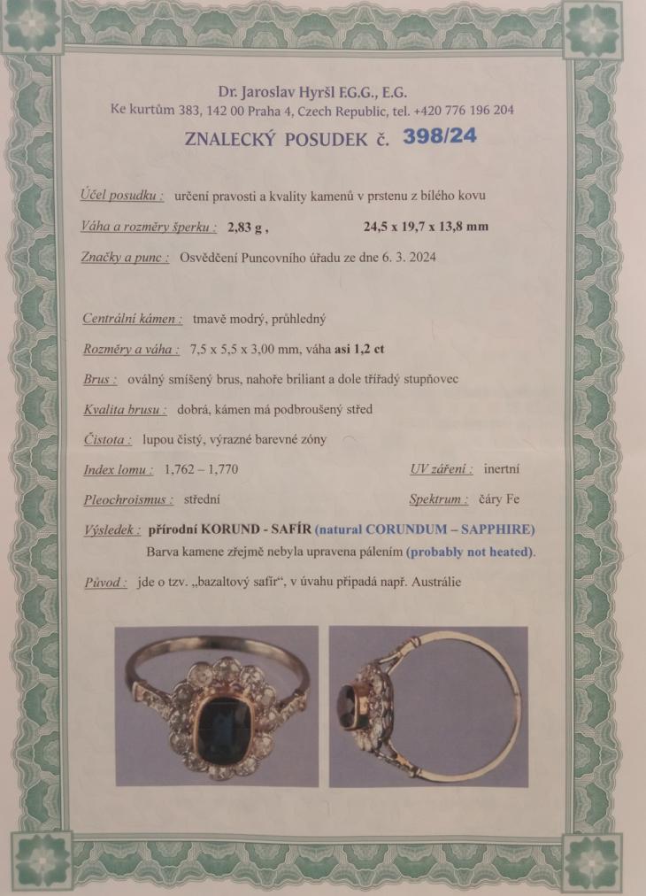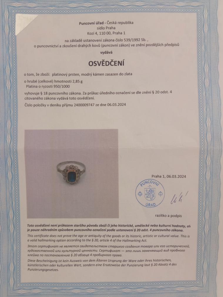Platinový prsten o ryzosti 950/1000 s puncovním osvědčením. Hlavu prstenu tvoří 12 diamantů, každý o velikosti cca 0,035 ct. Objímají velký modrý přírodní safír zasazený ve žlutém zlatě o velikosti cca 1,2 ct. Jde o tzv. "bazaltový safír". Tenká obroučka u hlavy prstenu je zdobena šesti malými routami, každá o velikosti 0,006 ct. Dohromady je na prstenu přibližně 0,46 ct diamantů. Rozměr hlavy prstenu je 14 x 12 mm. Váha šperku je 2,84 g a jeho velikost je 56.