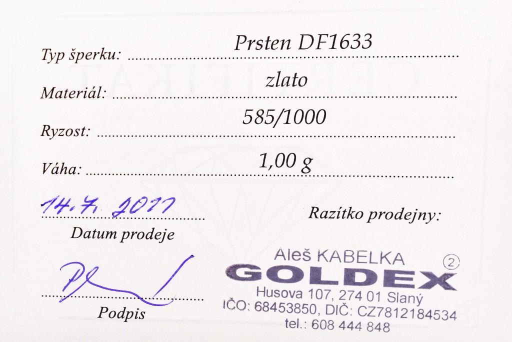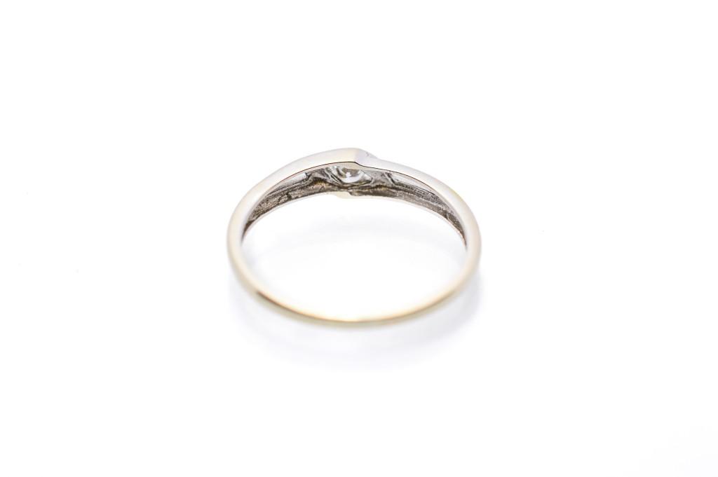 Prsten z bílého zlata s diamantem, vel. 48, ryzost 585/1000, punc labuť, váha 0,97 g. Přírodní diamant briliantového brusu, 0,075 ct, čistota Si, barva G. V nejširším bodě 3,5 mm.