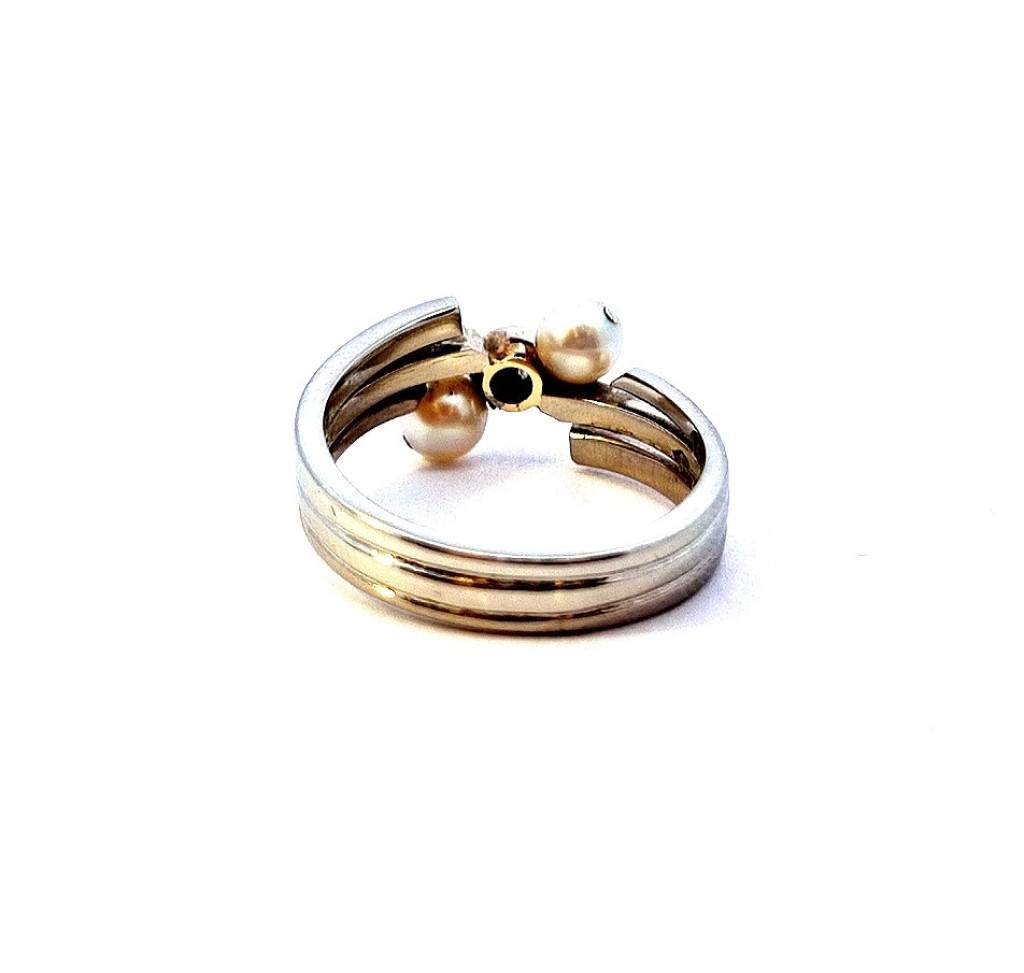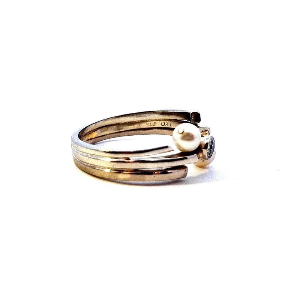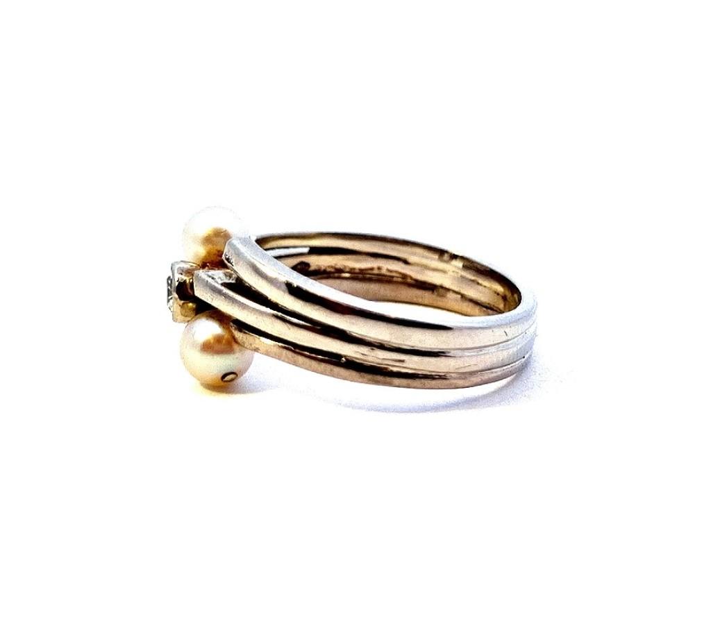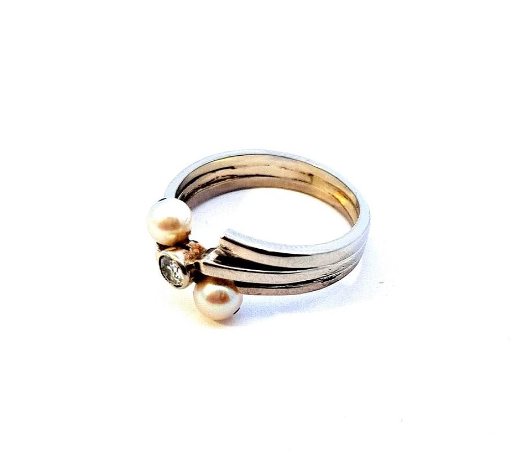 Zlatý prsten o ryzosti 585/1000, punc labuť, váha 4,87 g, velikost 54, v nejširším bodě 9 mm, průměr perel 4 mm. Kámen - diamant briliantového brusu - cca 0,18 ct, barva K-L, kvalita SI2.