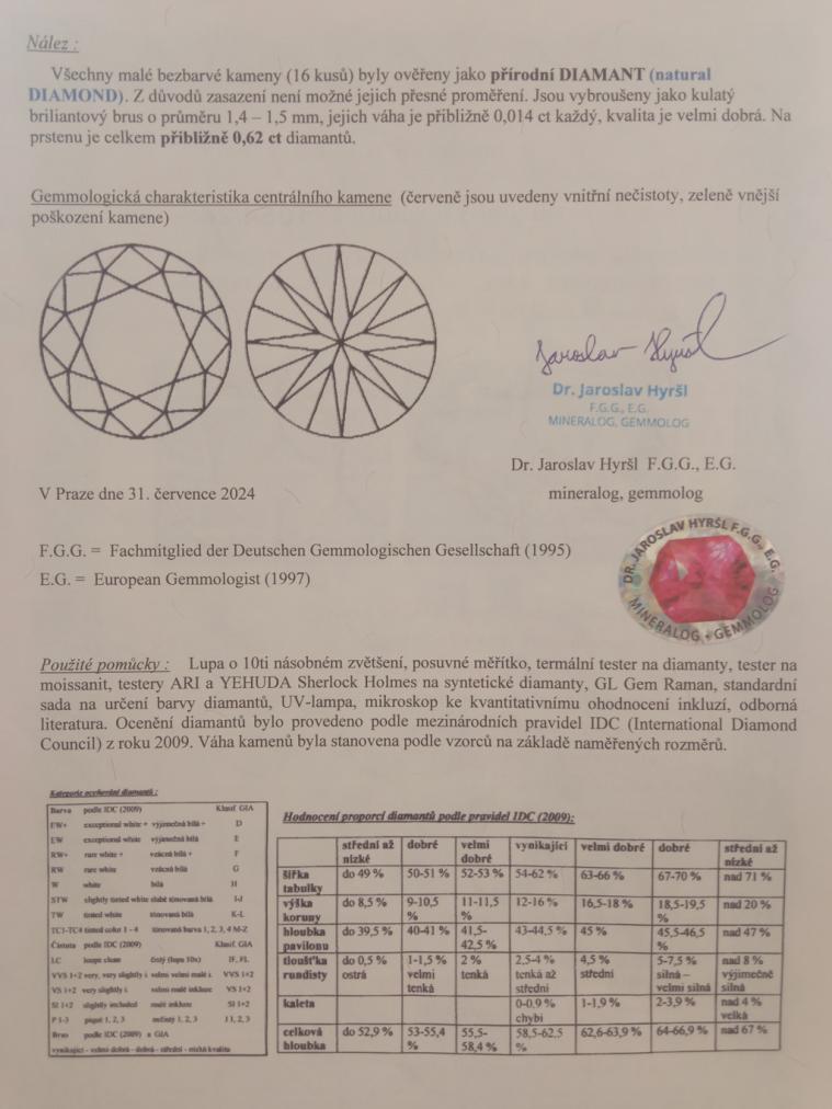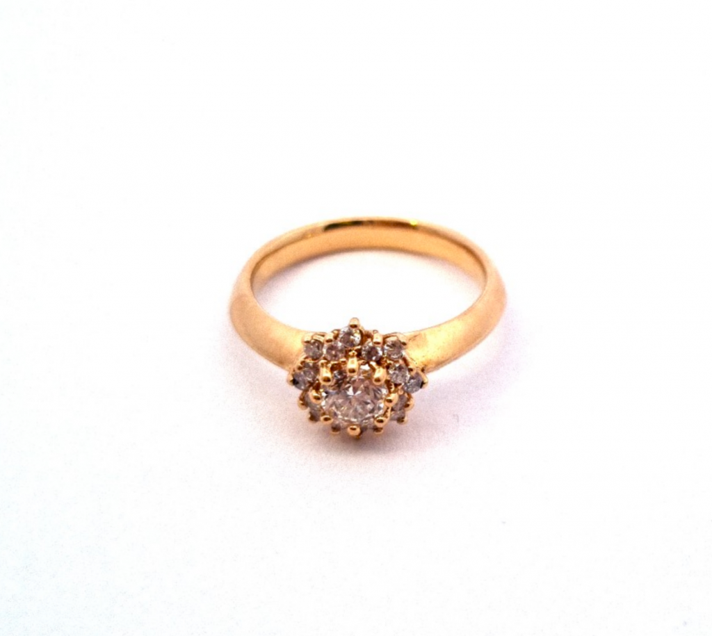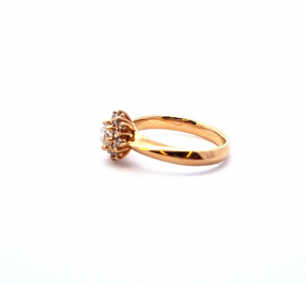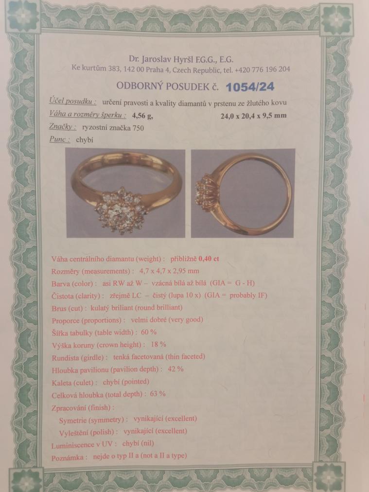Krásný prsten ze žlutého zlata o ryzosti 750/1000 s puncem kohout. Hlava prstenu připomíná květ a je bohatě osázena diamanty briliantového brusu. Centrální kámen je přibližné velikosti 0,4 ct. Kolem něj je rozmístěno 16 malých briliantů, každý o velikosti 0,014 ct. Průměr hlavy prstenu je 9 mm, velikost prstenu je 53. Celková váha kamenů v prstenu je cca 0,62 ct. Váha prstenu je 4,57 g. Pravost kamenů dokládáme certifikátem od gemmologa.