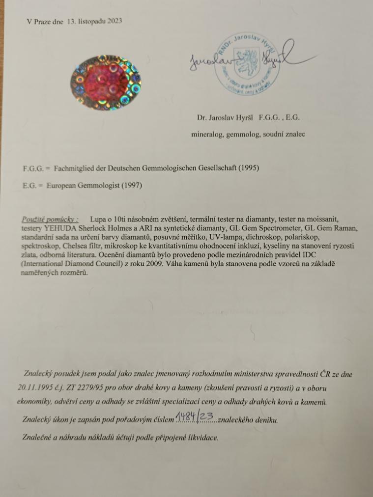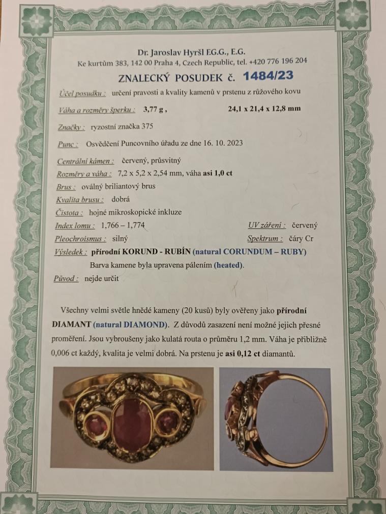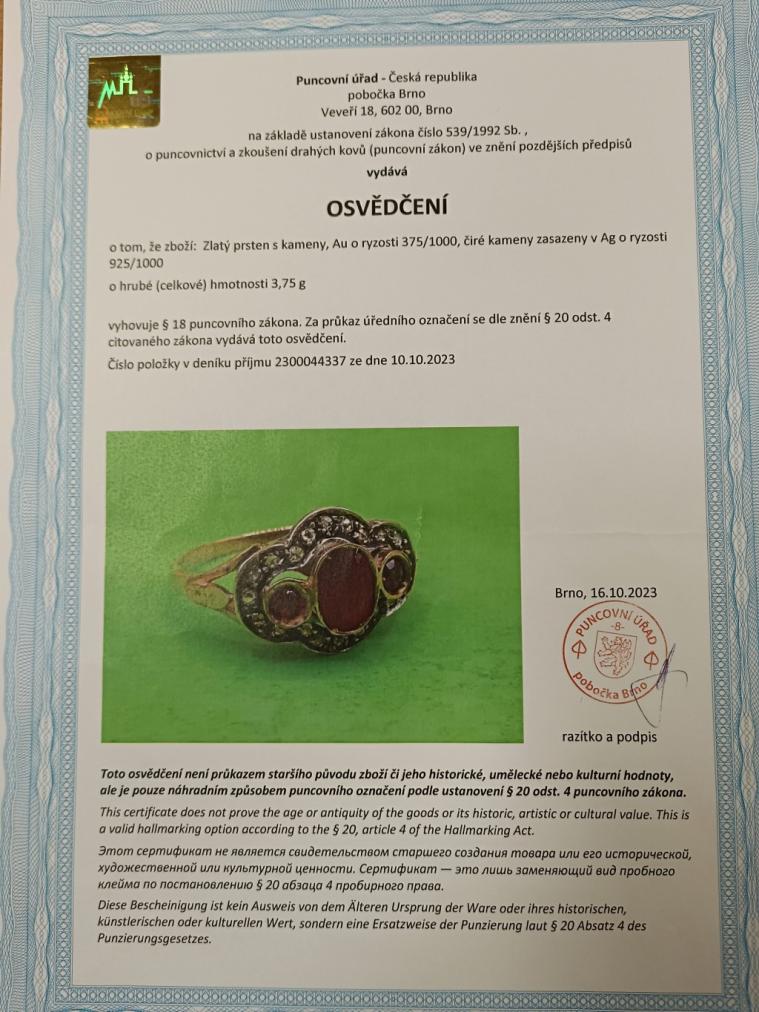 Zlatý prsten o ryzosti 375/1000, váha 3,75g, kameny zasazeny do stříbra. Diamanty celkem 0,12 ct, rubíny jsou přírodní cca 1 ct. V nejširším bodě 2,7 cm. Osvědčení o ryzosti z puncovního úřadu a posudek ke kamenům.