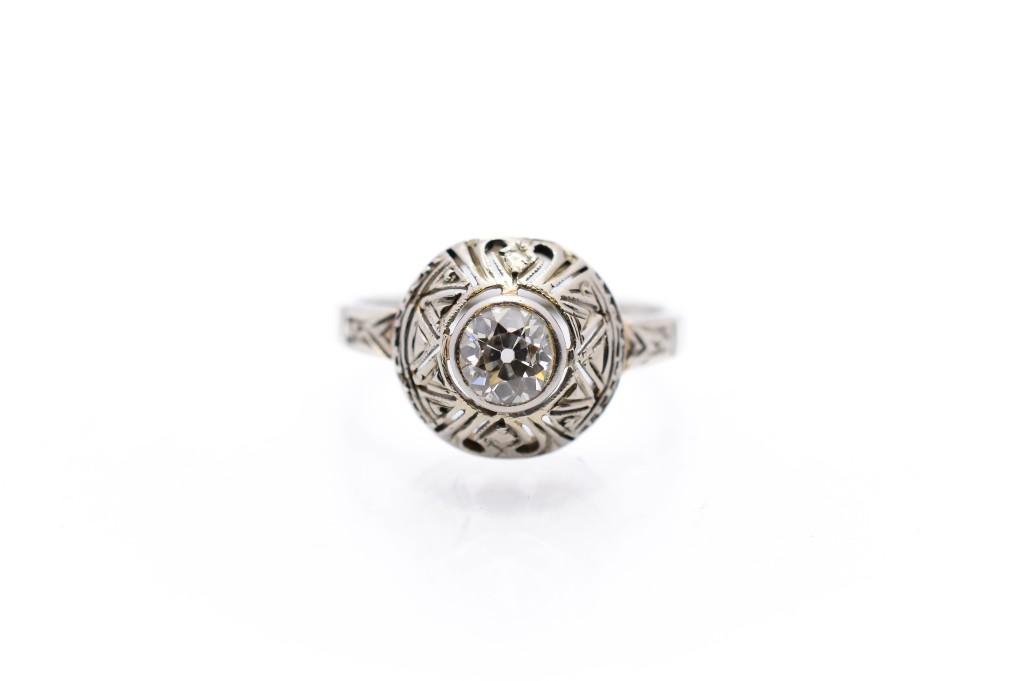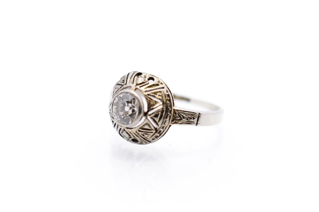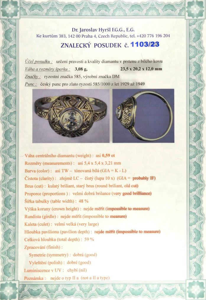 Zlatý prsten z bílého zlata o ryzosti 585/1000, punc lvíček. Velikost 54, váha 3,08 g, rozměr hlavy prstenu 12 x 13 mm. Kámen - přírodní diamant staroevropského brusu - celkem 1 ks, cca 0,59 ct, barva: TW, čistota: LC.
