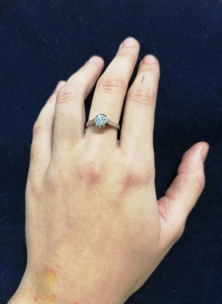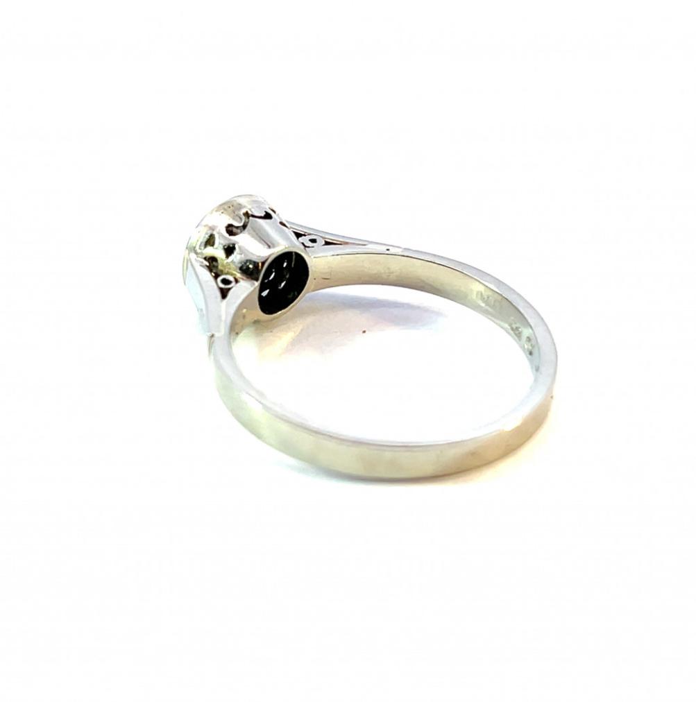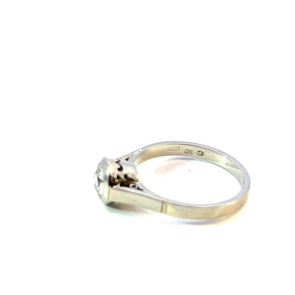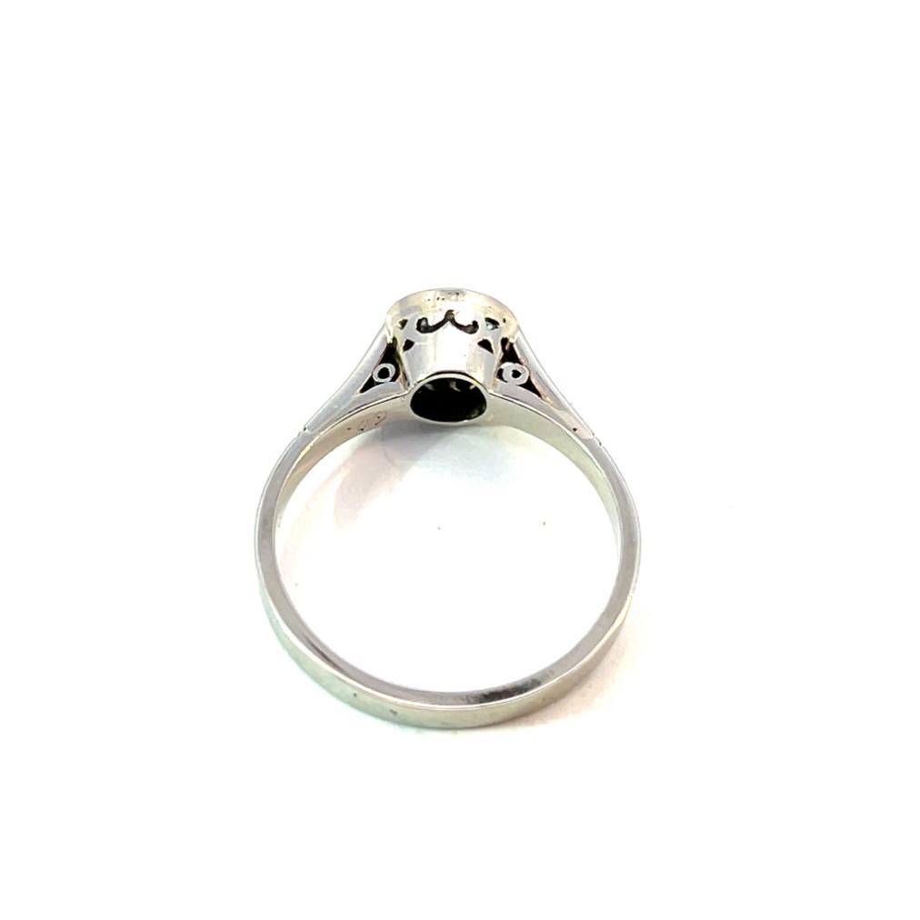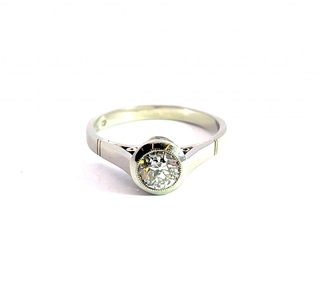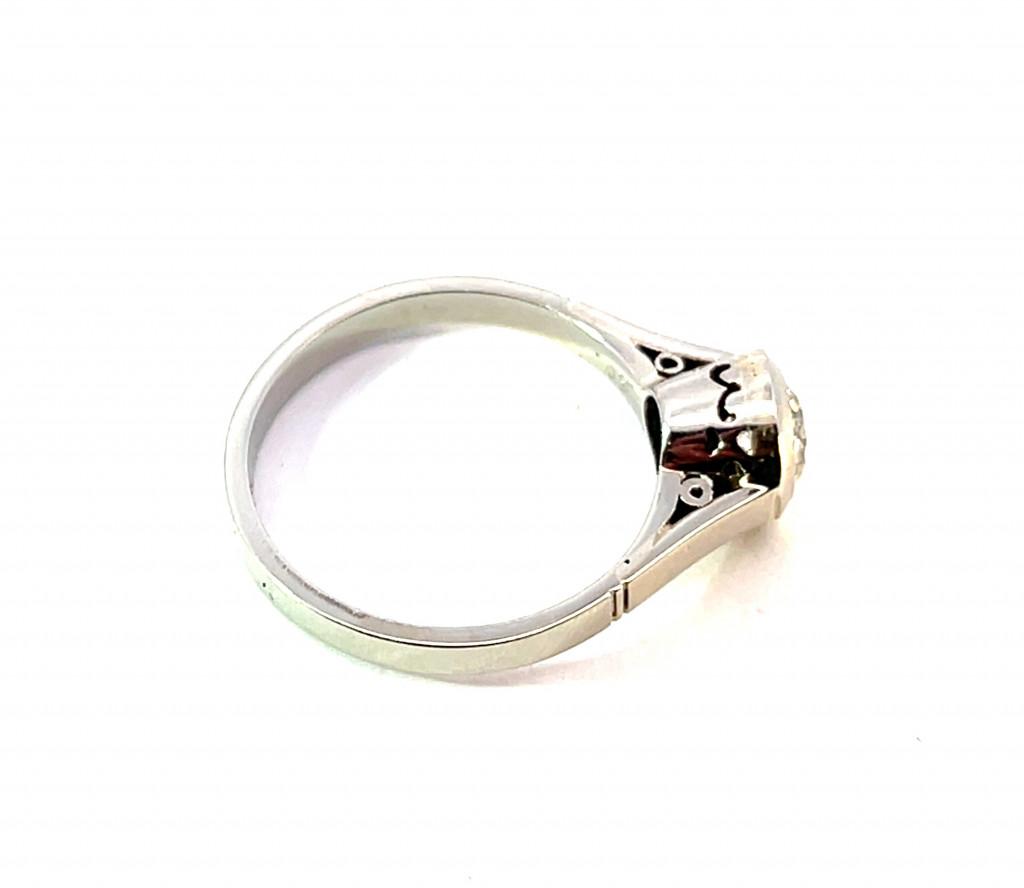 Prsten z bílého zlata o ryzosti 585/1000, punc lvíček. Velikost 54, váha 2,92 g, v nejširším bodě 7 mm. Kámen - přírodní diamant staroevropského brusu - 1 ks, cca 0,60 ct, viditelné inkluze.