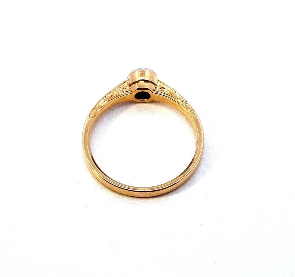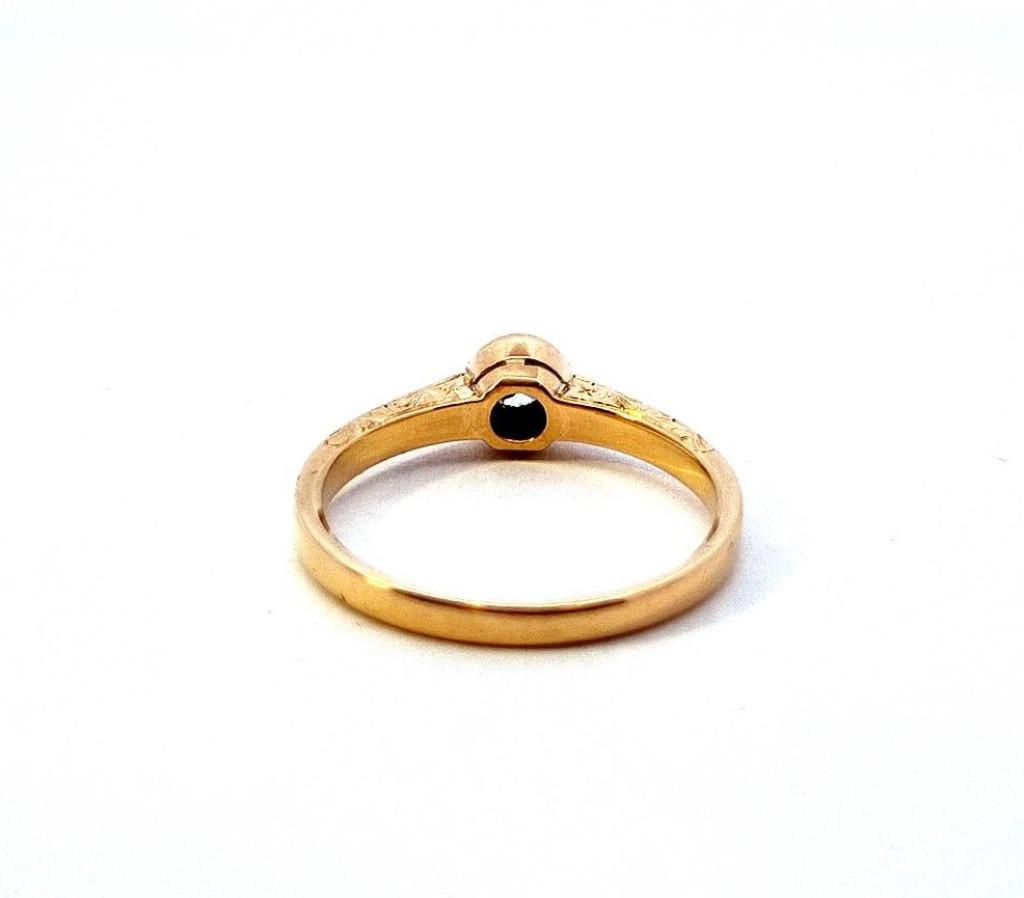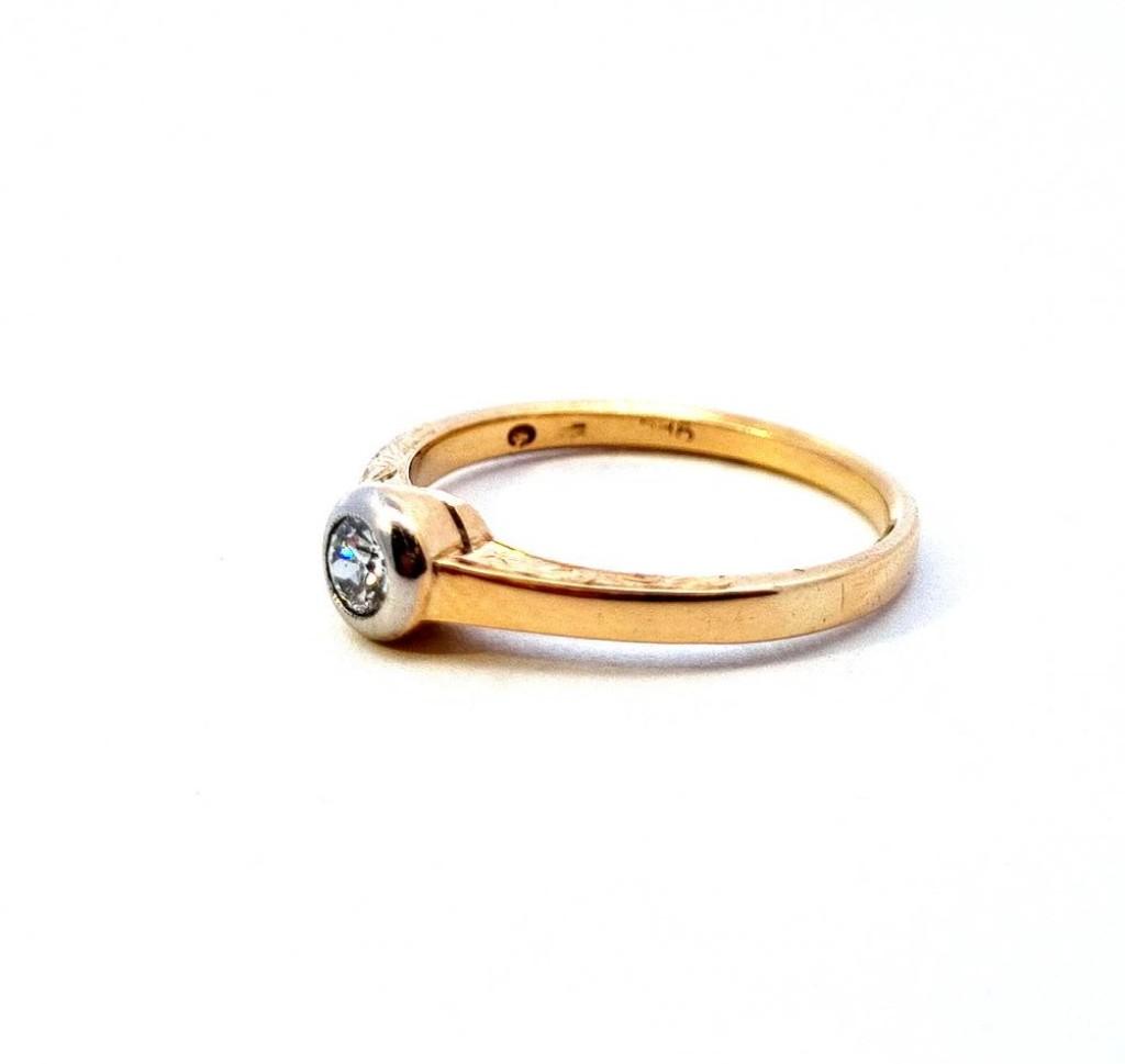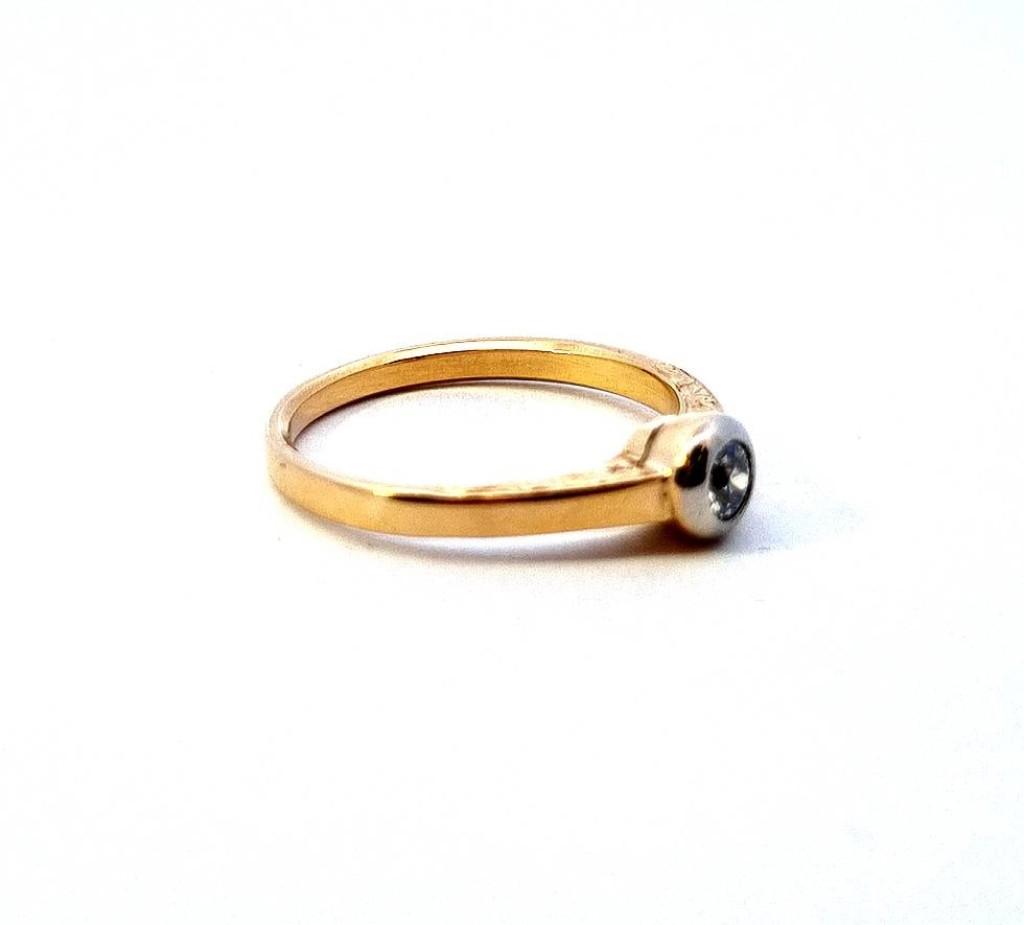Zlatý prsten o ryzosti 585/1000, punc lvíček. Velikost 59, váha 3,66 g, v nejširším bodě 6 mm. Kámen - přírodní diamant staroevropského brusu - celkem 1 ks, cca 0,20 ct.