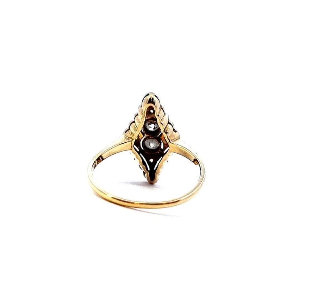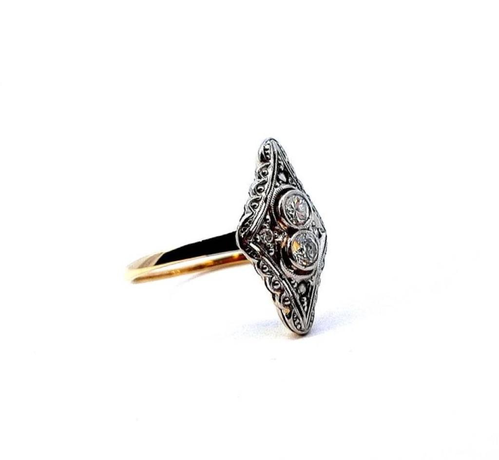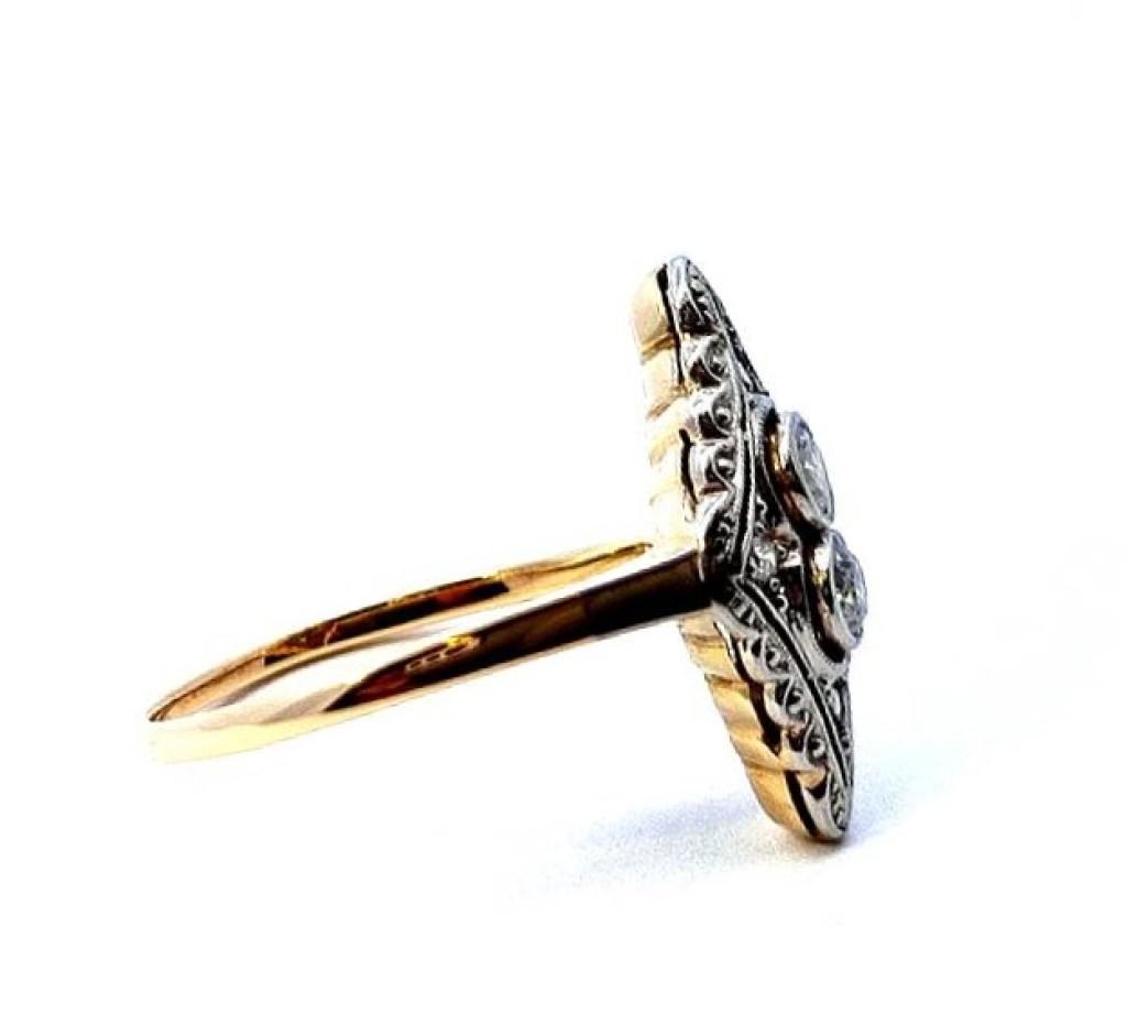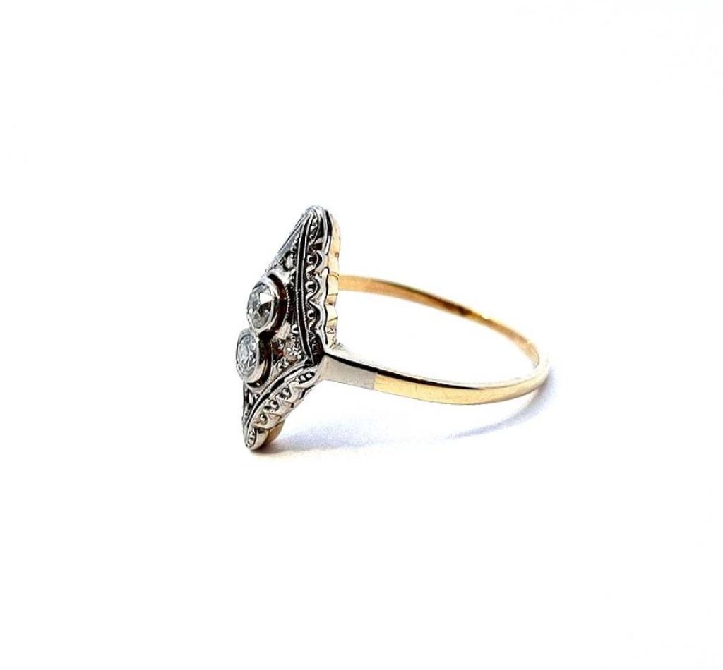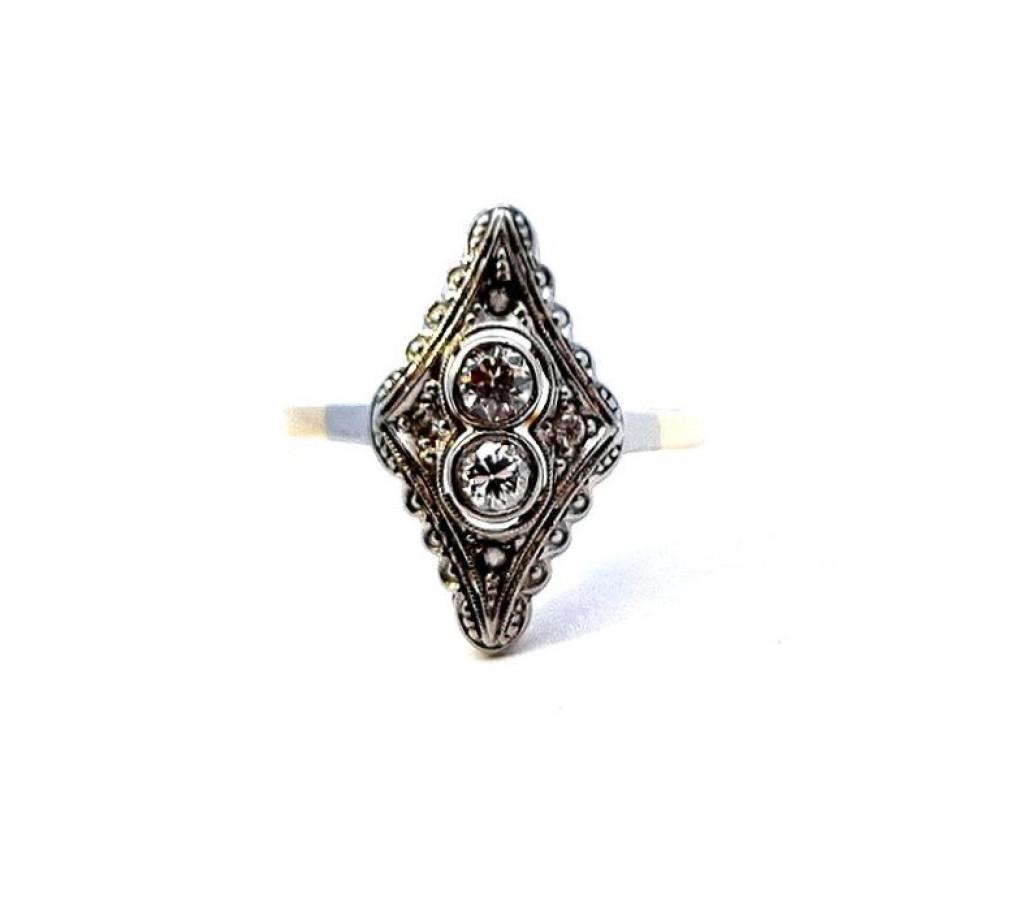 Zlatý prsten o ryzosti 585/1000, punc kukuřičný klas. Velikost 53, váha 2,24 g, rozměr hlavy prstenu 18 x 10 mm. Kámen - přírodní diamant staroevropského brusu - centrální kameny: 2 ks, cca 0,10 ct každý, okolní menší kameny: 4 ks, cca 0,005 ct každý. Dohromady cca 0,22 ct.