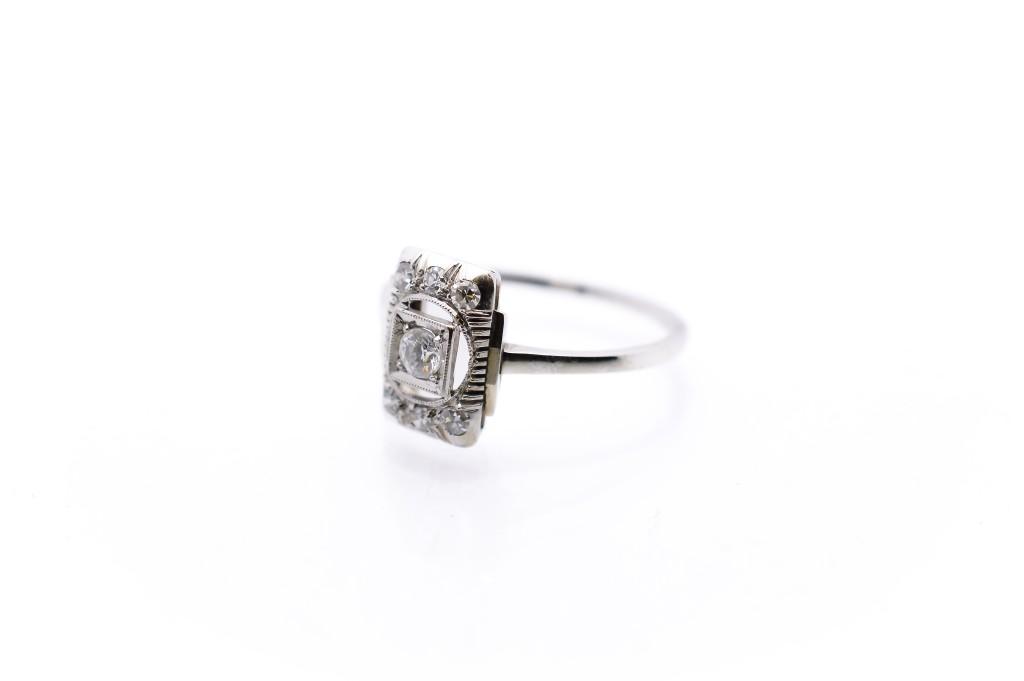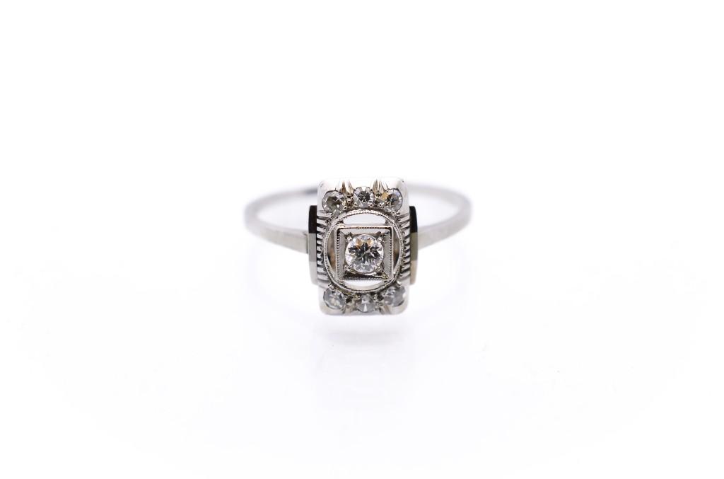 Zlatý prsten z bílého zlata o ryzosti 585/1000, punc lvíček. Velikost 54, váha 1,71 g, rozměry hlavy prstenu 11 x 9 mm. Kámen - přírodní diamant staroevropského brusu - centrální kámen větší: 1 ks, cca 0,10 ct. Boční kameny menší: 6 ks, cca 0,24 ct. Dohromady cca 0,34 ct.