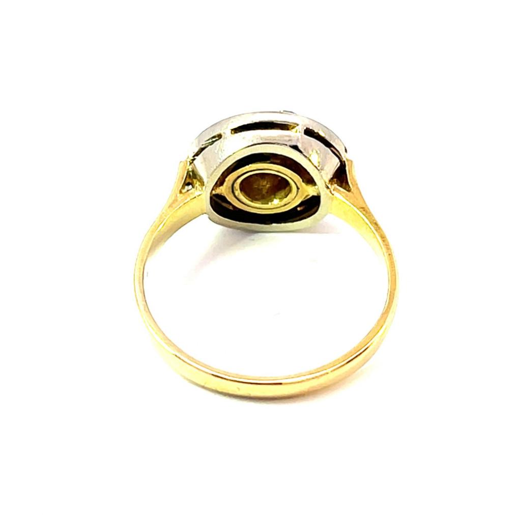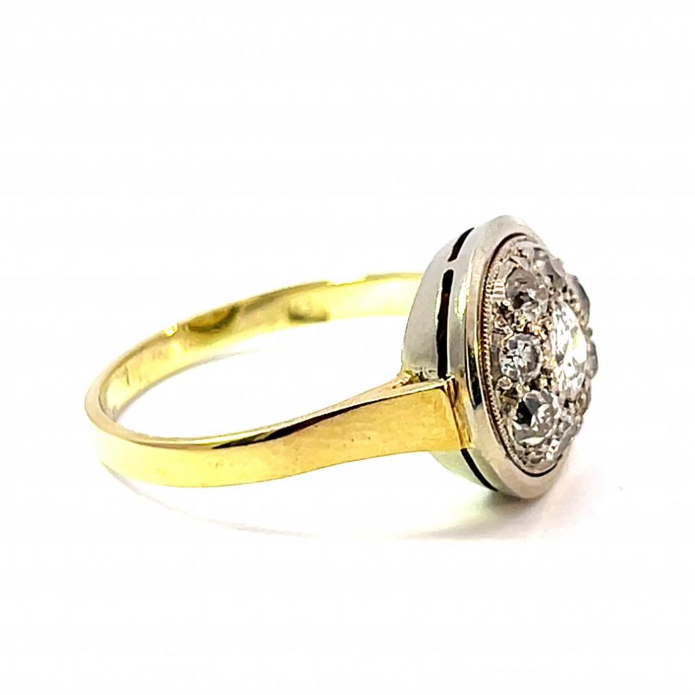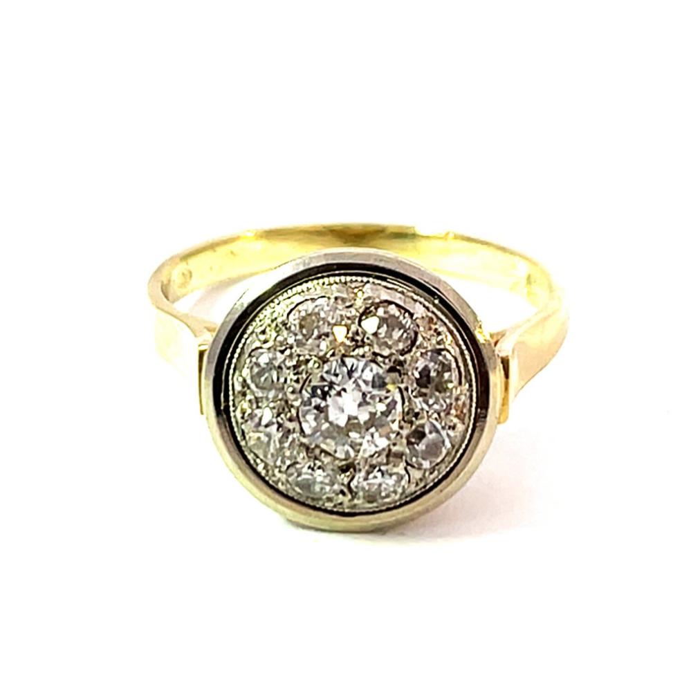 Prsten z kombinace žlutého a bílého zlata o ryzosti 585/1000, punc lvíček. Velikost 55, váha 4,92 g, průměr ozdoby 12,5 mm. Kámen - přírodní diamant staroevropského brusu - 9 ks, centrální kámen: 1 ks, cca 0,25 ct, ostatní větší kameny: 3 ks - cca 0,09 ct, ostatní kameny menší: 5 ks - cca 0,07 ct - dohromady cca 0,81 ct.