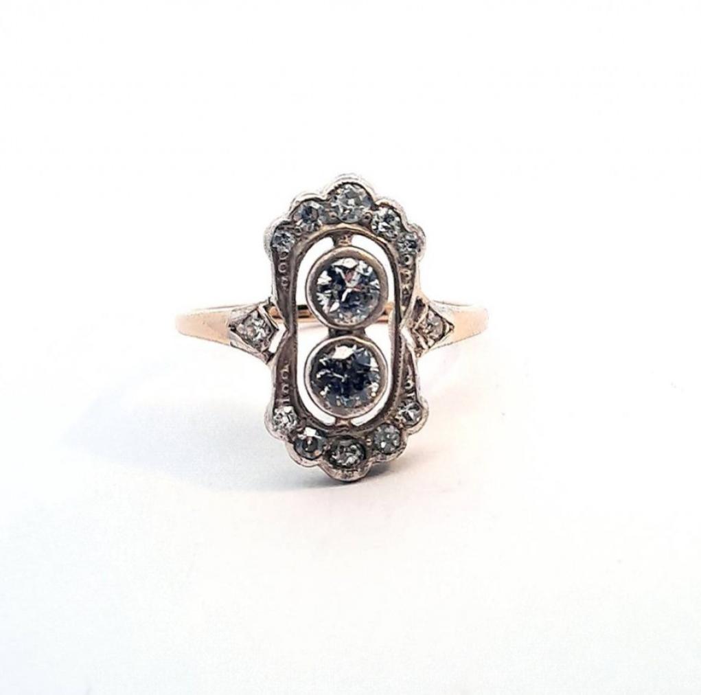 Prsten z kombinace bílého a žlutého zlata o ryzosti 580/1000, punc liška. Velikost 52, váha 2,91 g, rozměr hlavy prstenu 17,5 x 9 mm. Kámen - přírodní diamant briliantového brusu - 14 ks, centrální kameny: 2 ks, cca 0,20 ct každý, centrální spodní a vrchní kameny: 2 ks, cca 0,05 ct každý, ostatní kameny 10 ks, dohromady cca 0,14 ct - celkem cca 0,64 ct.