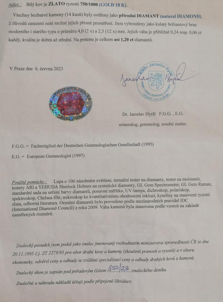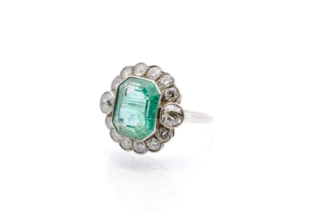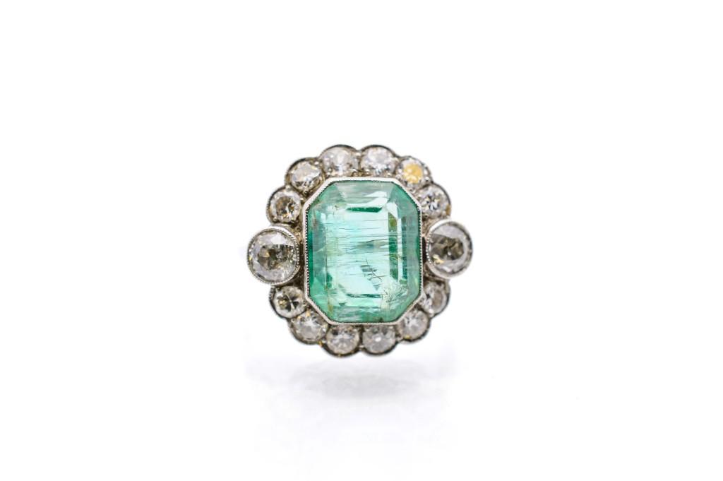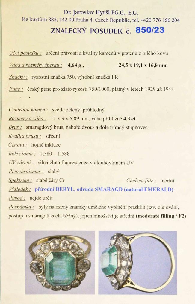 Starožitný zlatý prsten se smaragdem a diamanty, vel. 53, ryzost 750/1000, punc lvíček, váha 4,64g. Kameny jsou přírodní, smaragd cca 4,3 ct, diamanty celkem 14 kusů, celkem cca 1,2 ct.