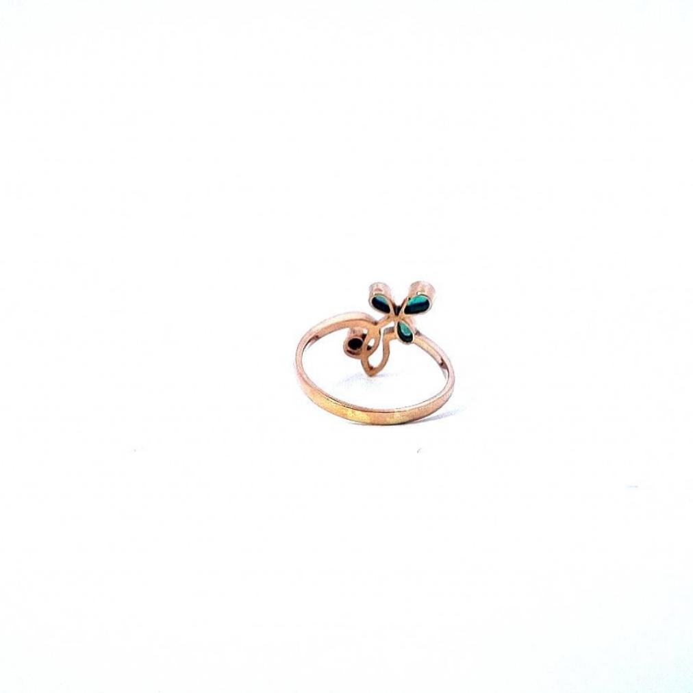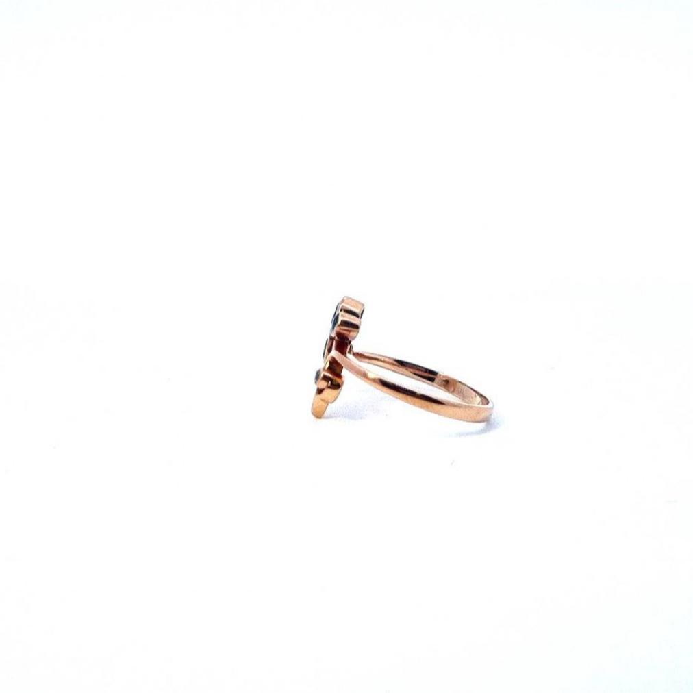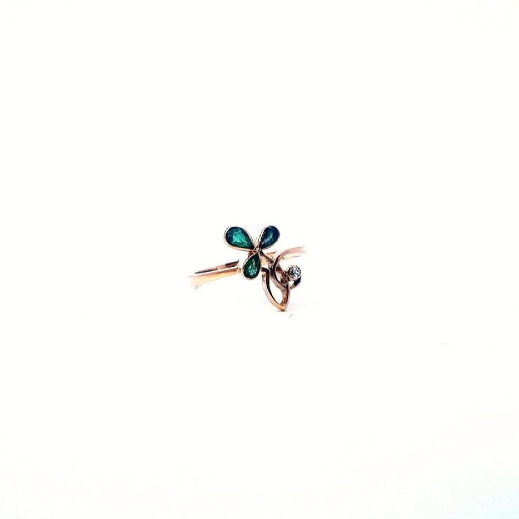 Prsten z růžového zlata o ryzosti 585/1000, punc liška - Rakousko - Uhersko. Velikost 58, váha 2,82 g, v nejširším bodě 15 mm. Kámen - přírodní smaragd - 3 ks, na 2 ks lehké oťuky. Kámen - přírodní diamant staroevropského brusu - 1 ks, cca 0,05 ct.