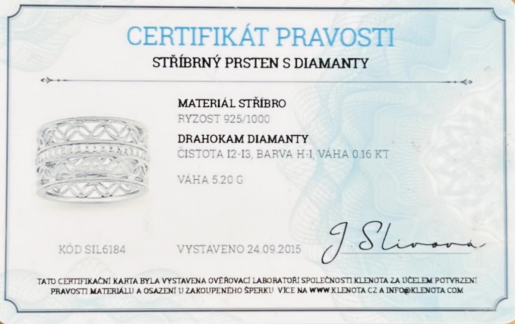 Stříbrný prsten o ryzosti 925/1000, váha 5,6 g, punc kamzík, v nejširším bodě 9 mm, kámen - diamant briliantového brusu - celkem 0,16 ct.