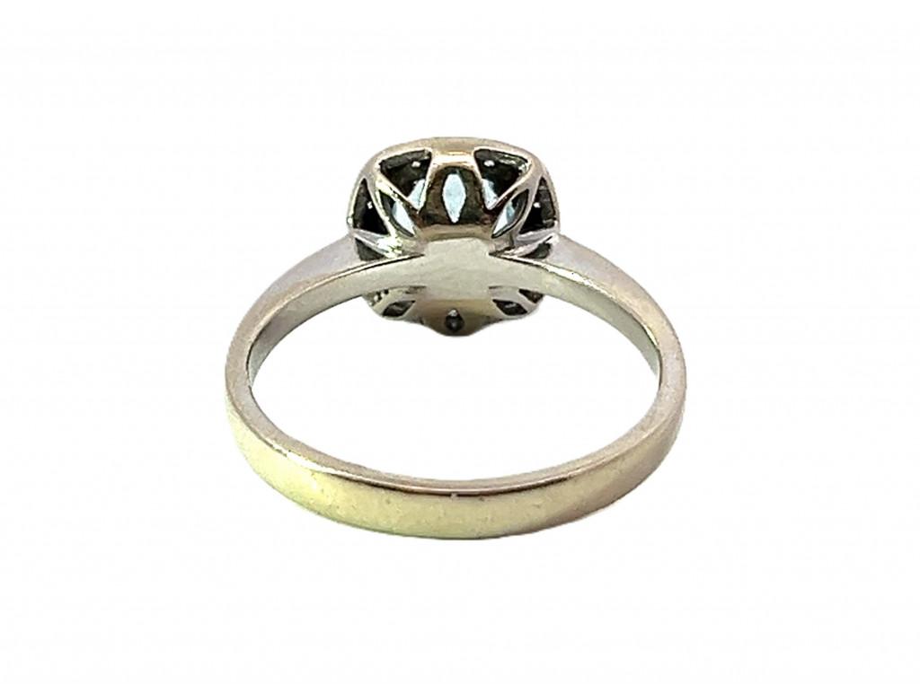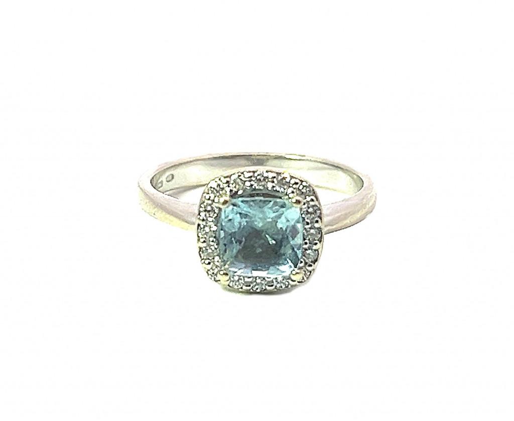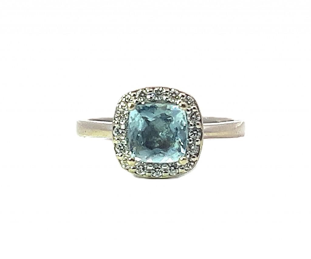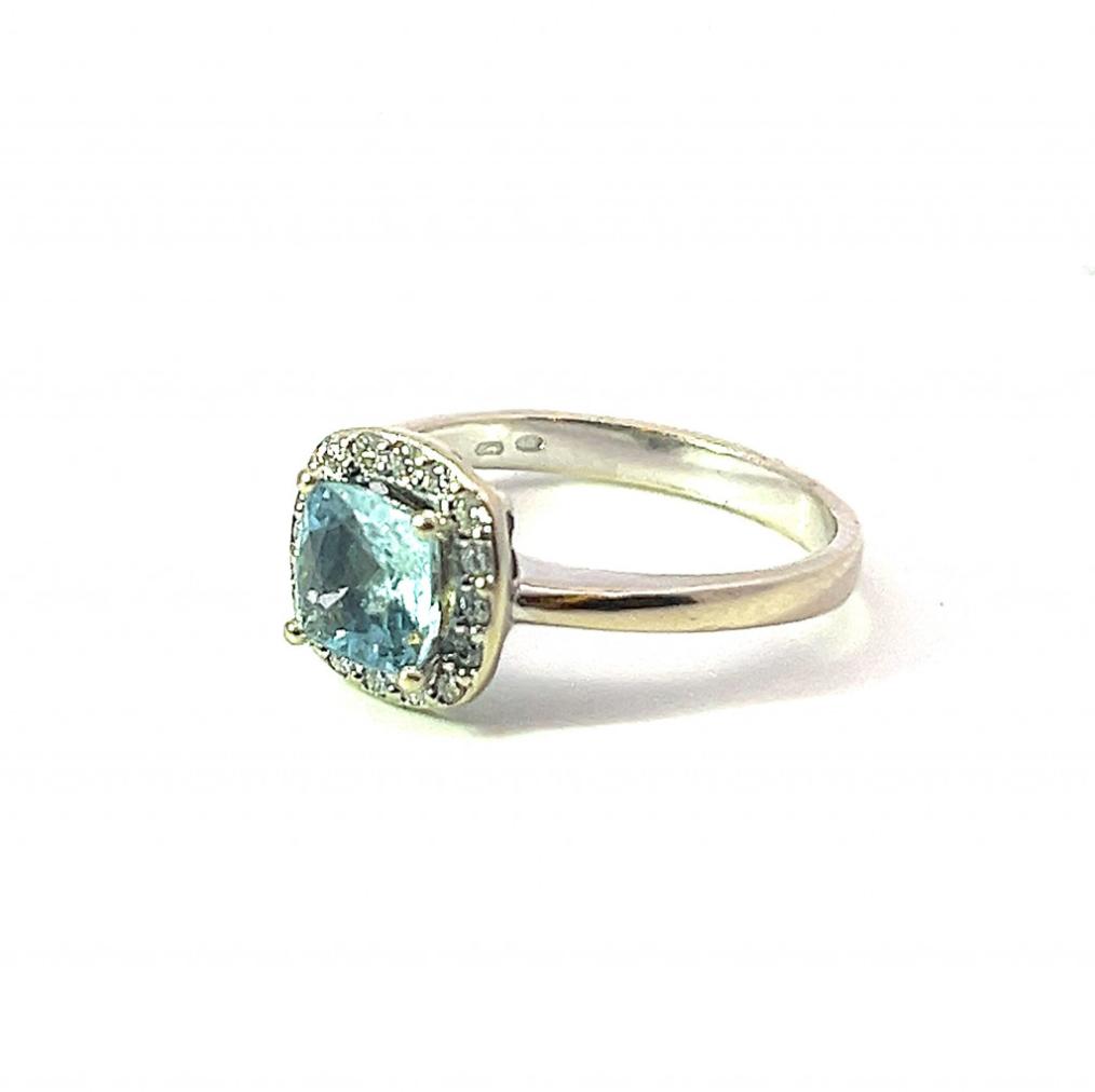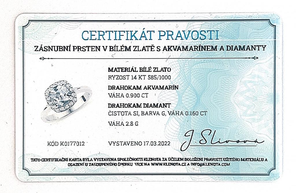 Prsten z bílého zlata o ryzosti 585/1000, punc labuť. Velikost 52, váha 2,80 g, v nejširším bodě 9,5 mm. Kámen - přírodní akvamarín - 1 ks, cca 0,90 ct. Kámen - přírodní diamant briliantového brusu - celkem 17 ks, cca 0,16 ct, čistota: SI, barva: G.