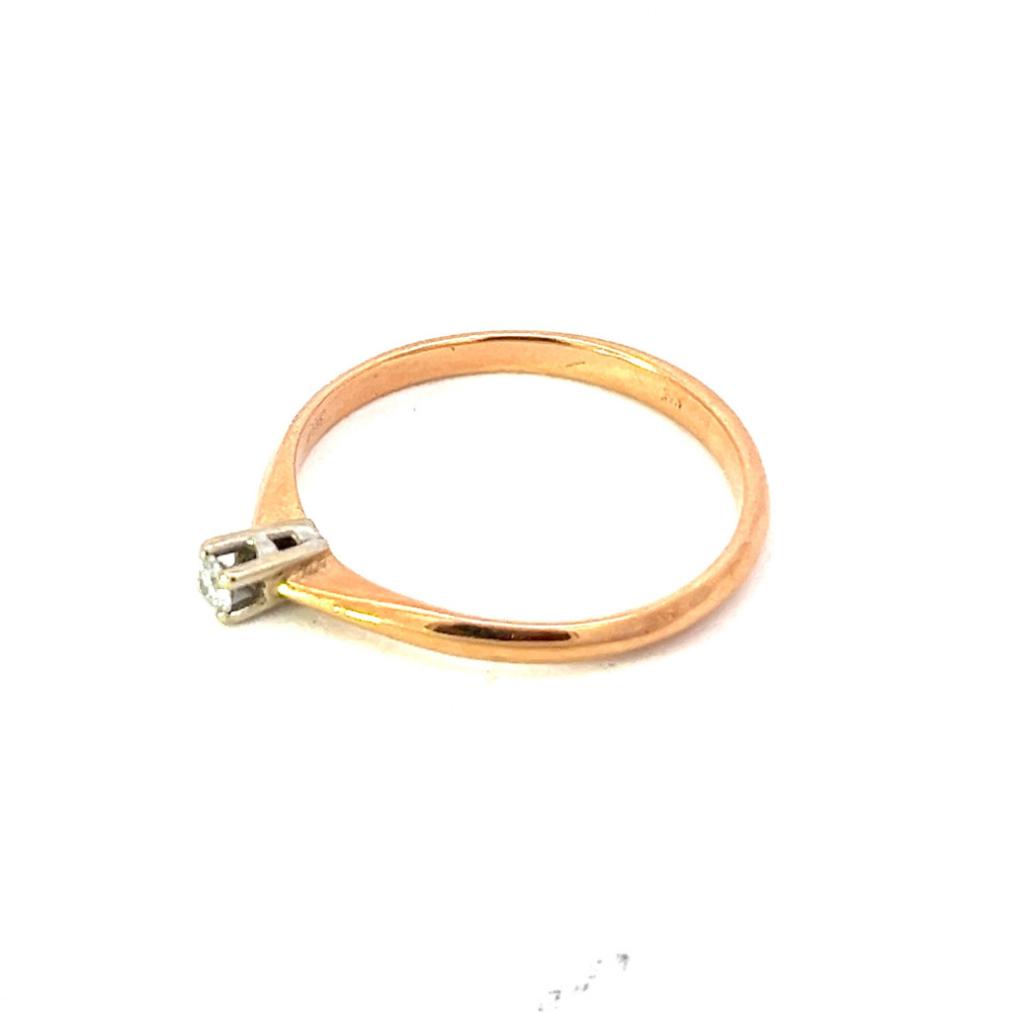 Prsten z růžového zlata v jednoduchém designu s briliantem. Zlato o ryzosti 585/1000 s puncem labuť. Váha 1,54 g, velikost 53. Šířka obroučky 2 mm. Kámen je diamant briliantového brusu a má cca 0,05 ct.