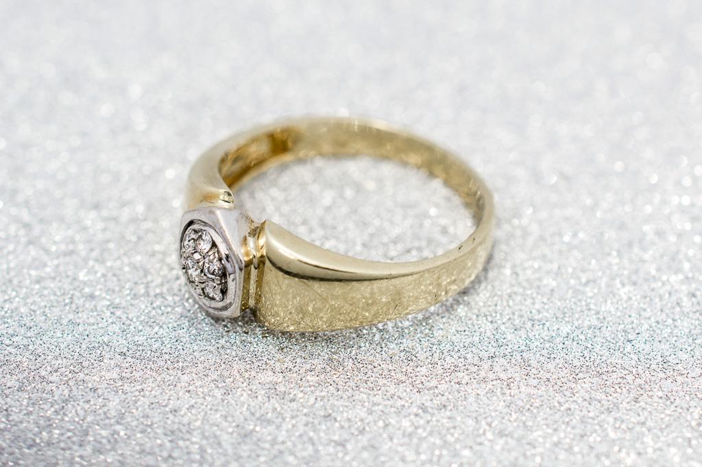 Briliantový prsten ve žlutém zlatě 585/1000, váha 2,90 g, velikost prstenu 55, briliant cca 1x 0,02, 6x 0,01 ct. Kameny na první dojem působí jako jeden velký kámen o velikosti 0,5 ct. Hodně muziky za rozumný peníz.