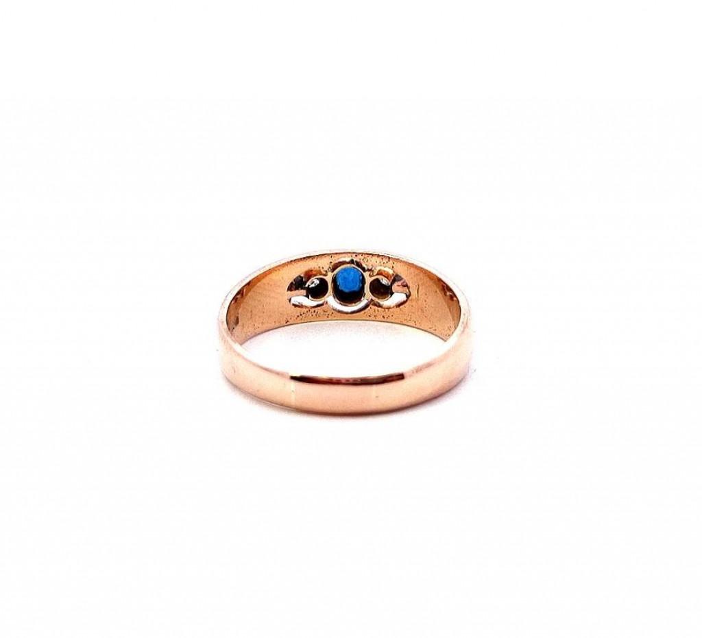 Krásný zlatý prsten se dvěma brilianty a safírem o ryzosti 585/1000 s puncem labuť. Váží 4,75 g, velikost 61. V nejširším bodě měří 7mm, velikost safíru je 5 x 7 mm. Na prstenu se nachází dva brilianty, které mají každý cca 0,10 ct.