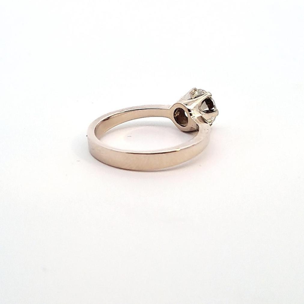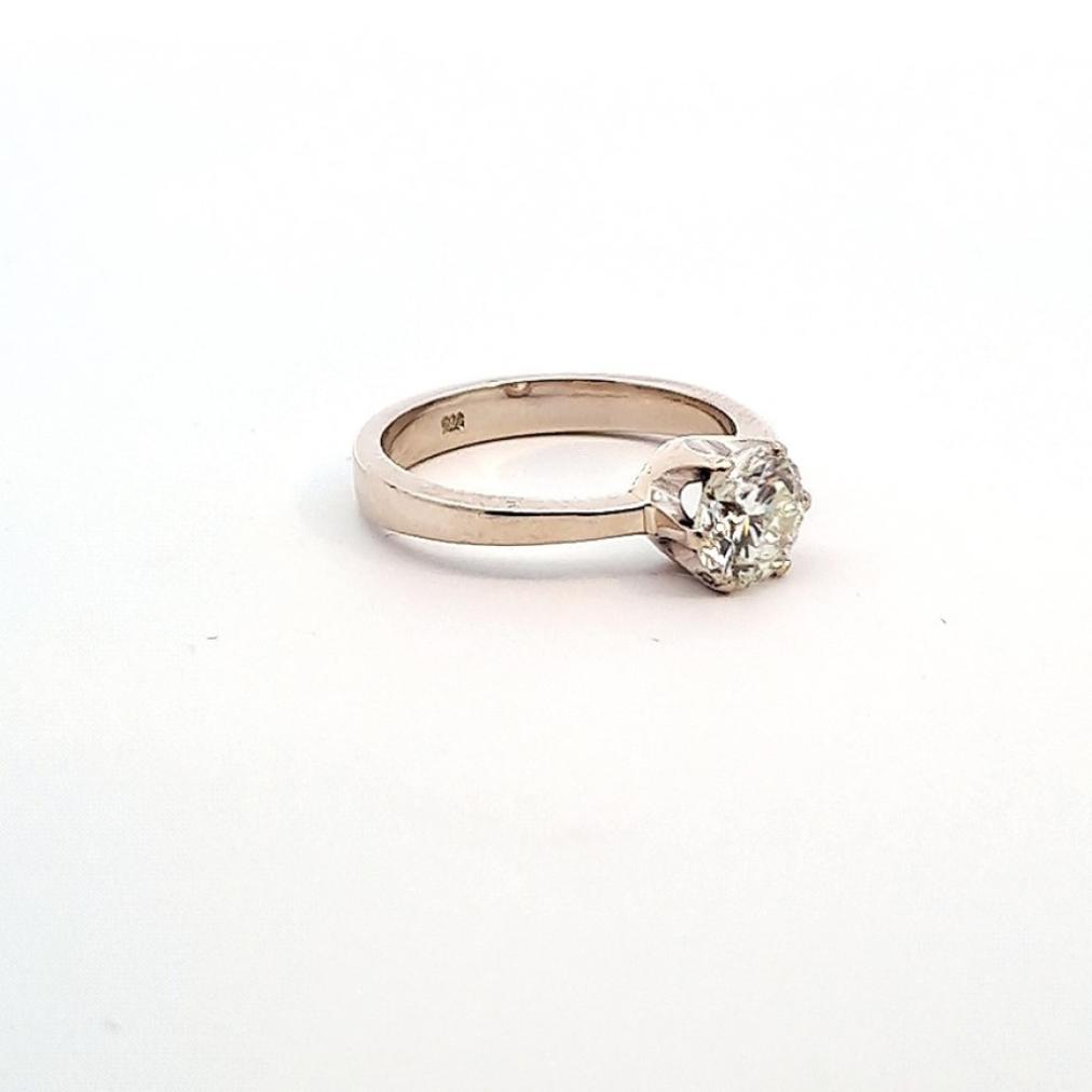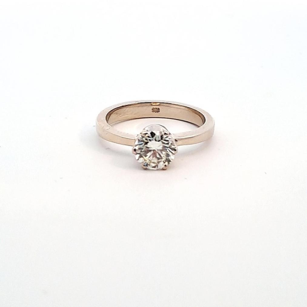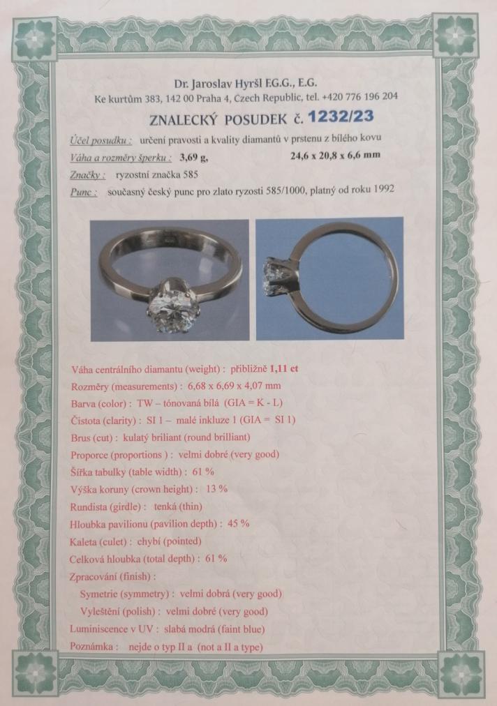 Zlatý prsten o ryzosti 585/1000, punc labuť. Velikost 54, váha 3,70 g. Kámen - přírodní diamant briliantového brusu - celkem 1 ks, cca 1,11 ct, barva TW, čistota SI 1.
