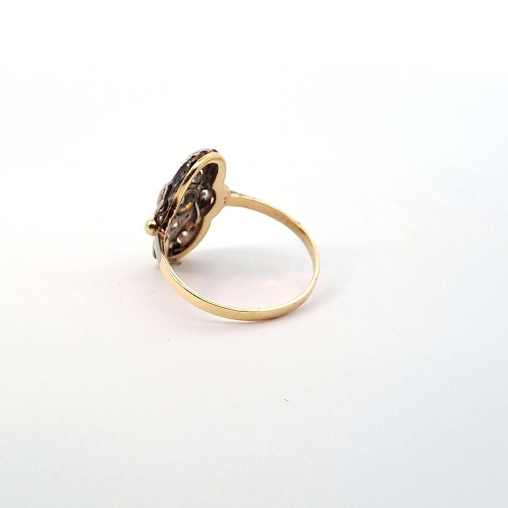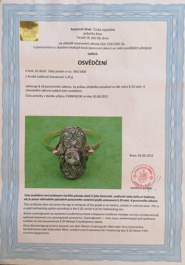 Zlatý prsten o ryzosti 585/1000, osvědčení z Puncovního úřadu. Velikost 55, váha 2,34 g, rozměry hlavy prstenu 13 x 18 mm. Kámen je přírodní diamant staroevropského brusu cca 0,22 ct.