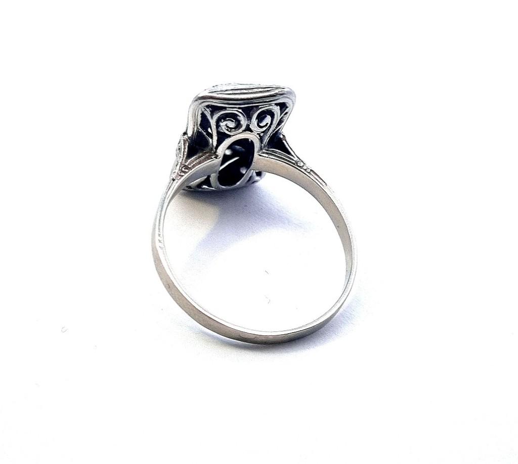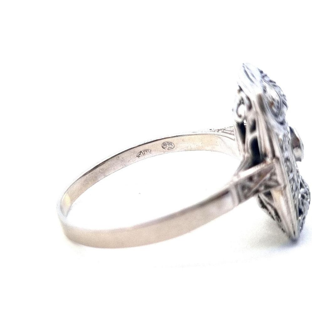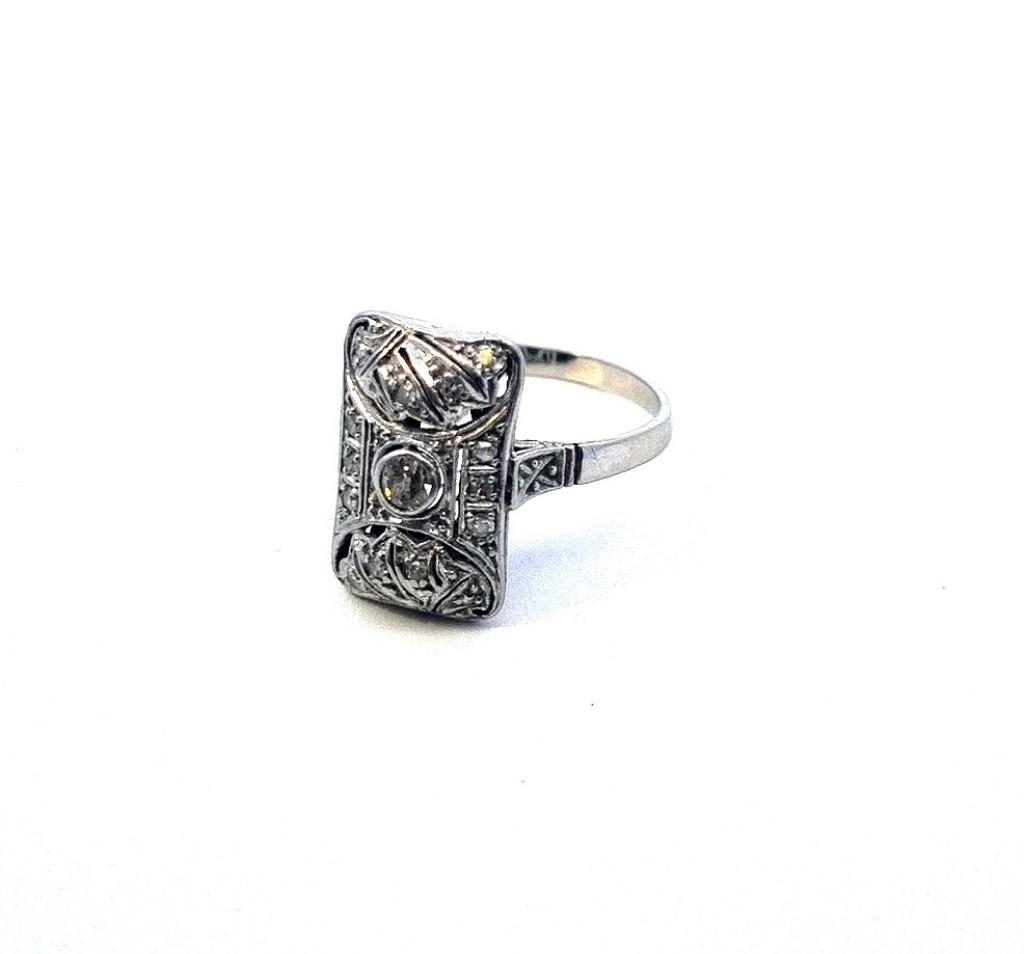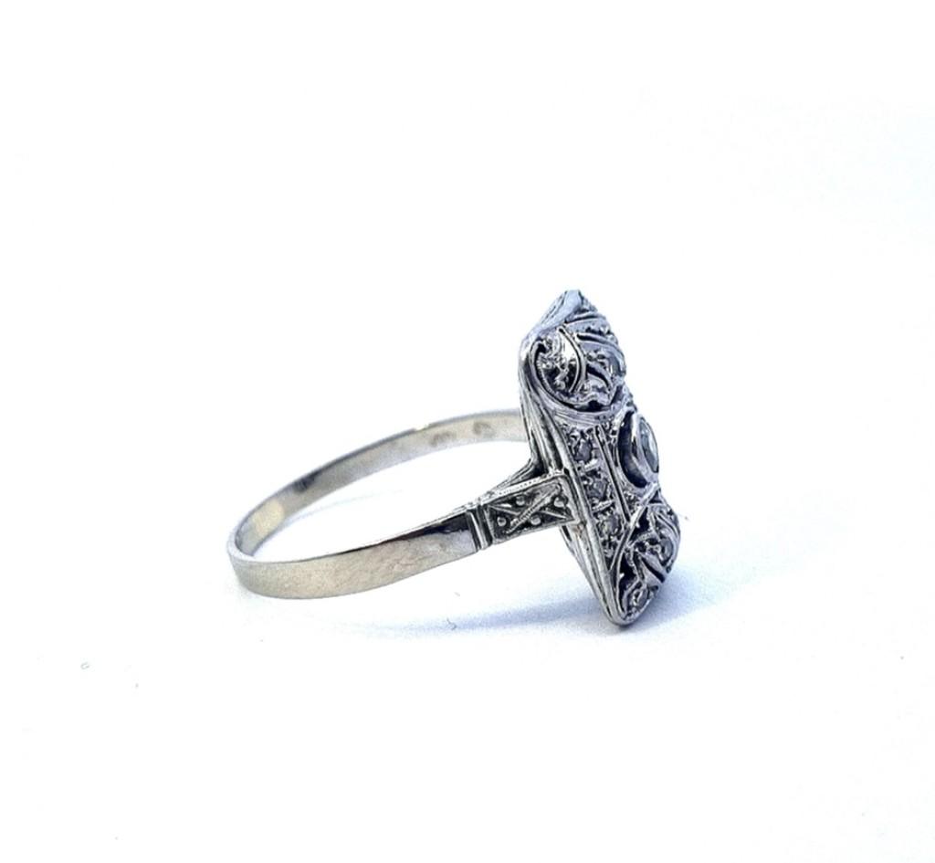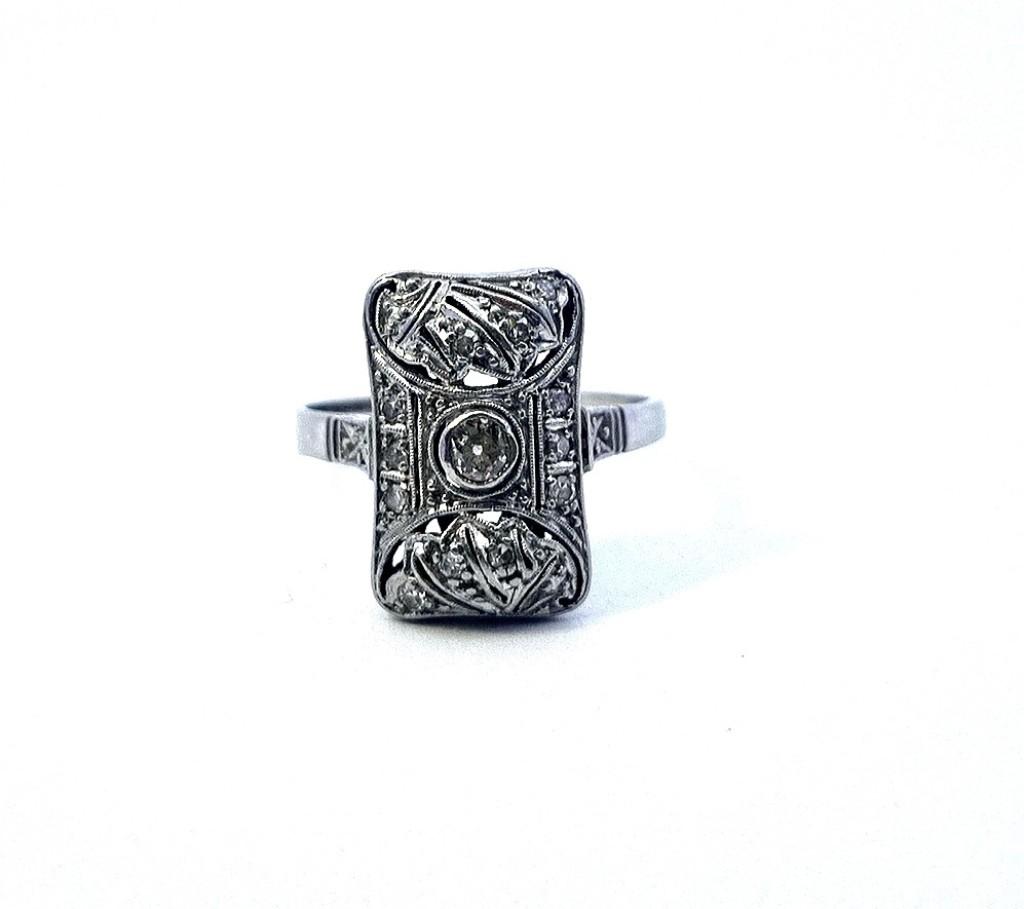 Zlatý prsten s diamantem, I. republika, vel. 53. Ryzost 585/1000, punc lvíček, váha 3,22 g. Centrální diamant je staroevropského brusu cca 0,08 ct, menší diamanty 12 ks, staroevropský brus celkem cca 0,12 ct. Dohromady celkem 0,2 ct.