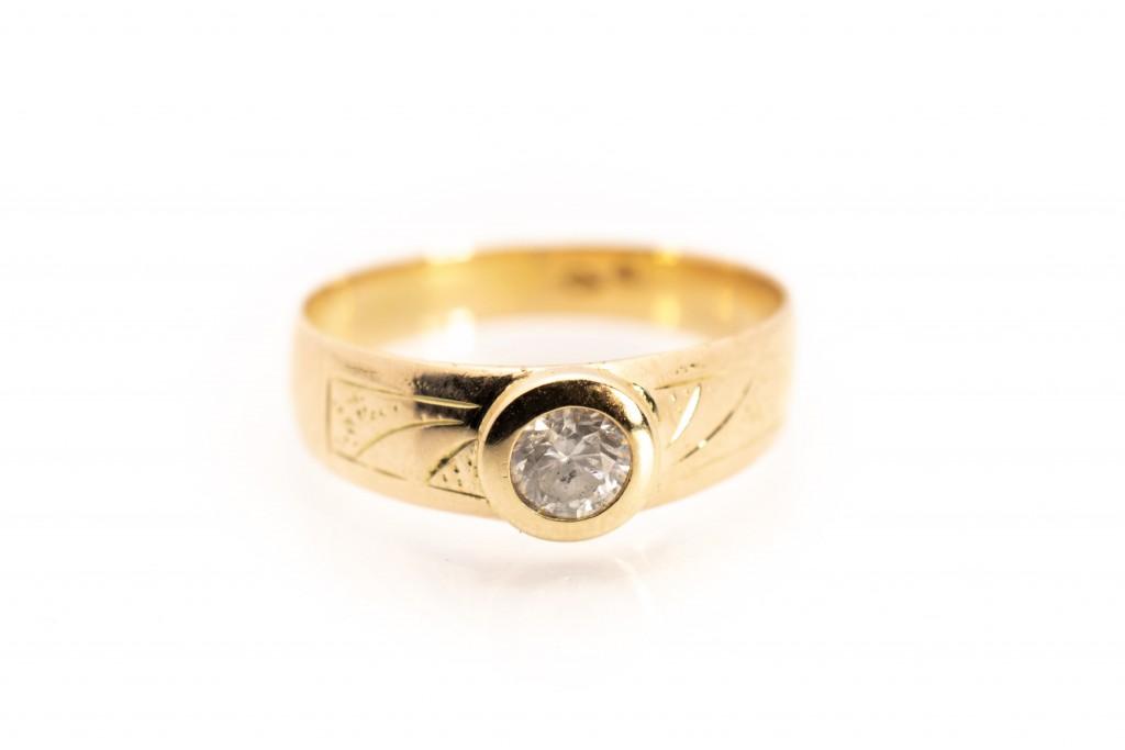 Zlatý prsten o ryzosti 580/1000, punc liška, váha 2,55 g, velikost 55, v nejširší bodě 6 mm, kámen - diamant cca 0,22ct