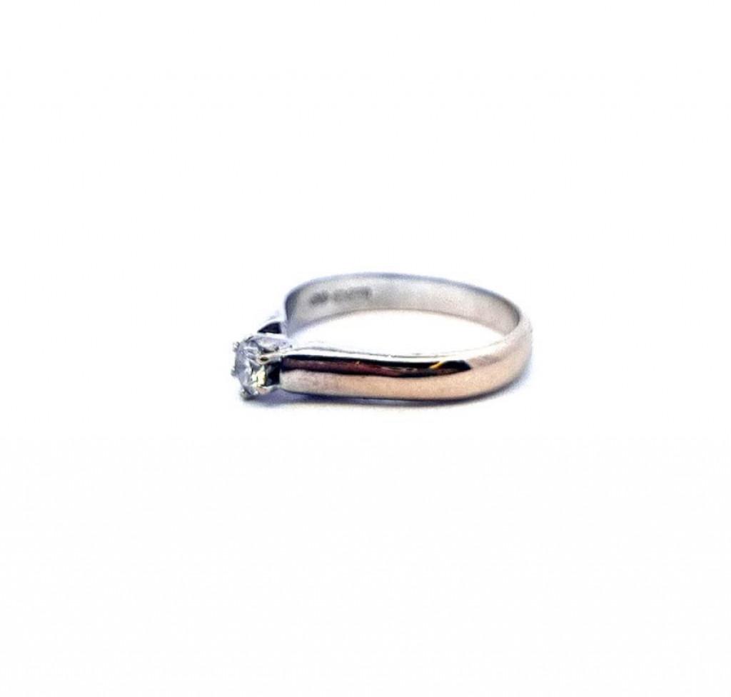 Prsten z bílého zlata o ryzosti 750/1000, punc kohout. Velikost 48, váha 2,89 g, v nejširším bodě 4,5 mm. Kámen - přírodní diamant briliantového brusu - 1 ks, cca 0,15 ct.