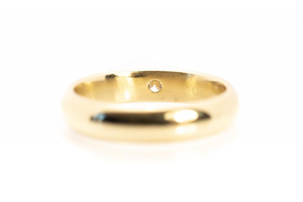 Zlatý prsten o ryzosti 585/1000, punc labuť, váha 3,99 g, velikost 51, v nejširším bodě 4 mm, kámen - diamant, cca 0,15 ct
