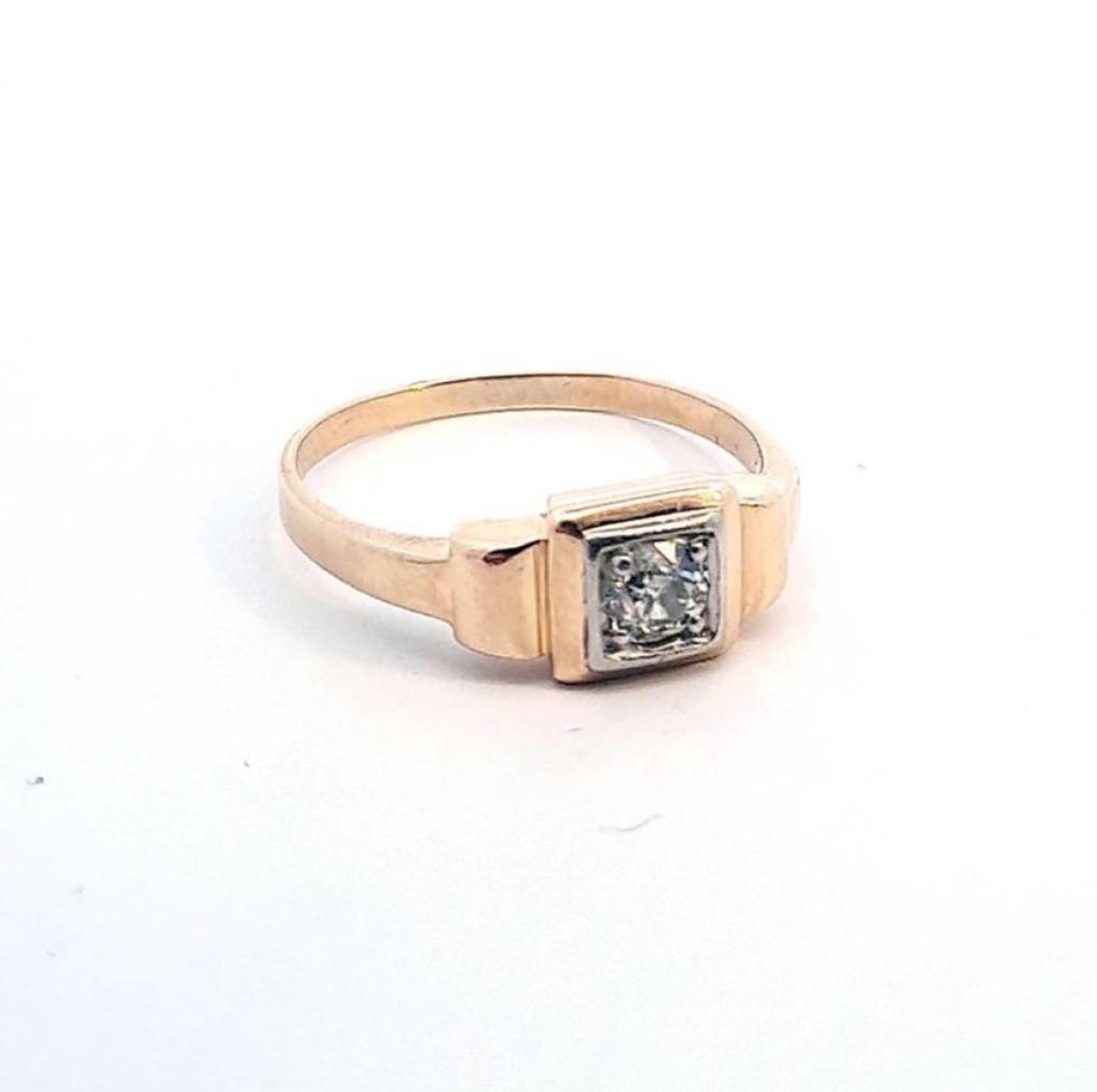 Zlatý prsten o ryzosti 585/1000, punc labuť. Velikost 54, váha 3,90 g, v nejširším bodě 7 mm. Kámen - přírodní diamant staroevropského brusu - 1 ks, cca 0,20 ct.
