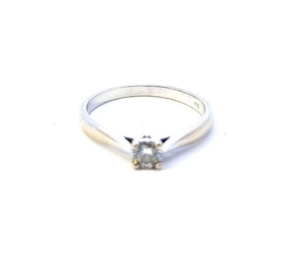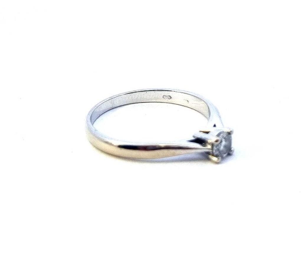 Zlatý prsten z bílého zlata o ryzosti 585/1000, punc labuť. Velikost 54, váha 2,17 g, v nejširším bodě 4 mm. Kámen - přírodní diamant briliantového brusu, 0,23 ct, čistota SI, barva G.