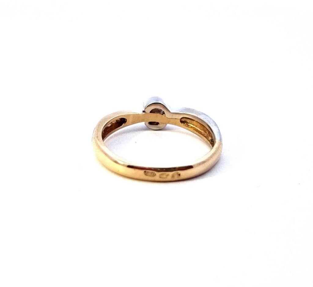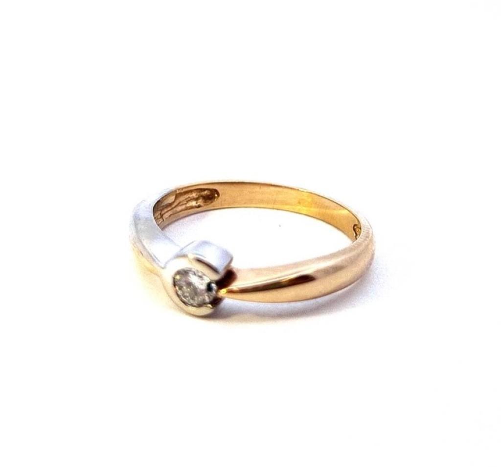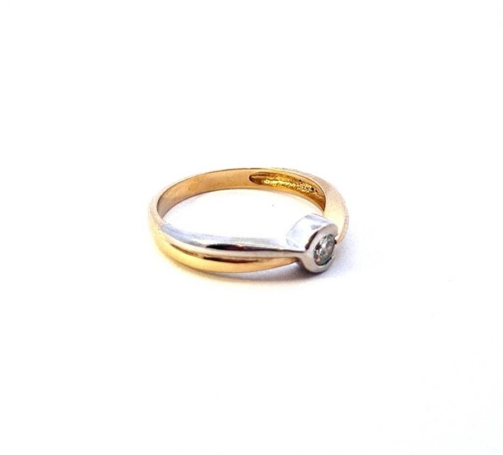 Zlatý prsten o ryzosti 585/1000, platný punc. Velikost 55, váha 3,27 g, v nejširším bodě 6 mm. Kámen - přírodní diamant briliantového brusu - celkem 1 ks, cca 0,20 ct