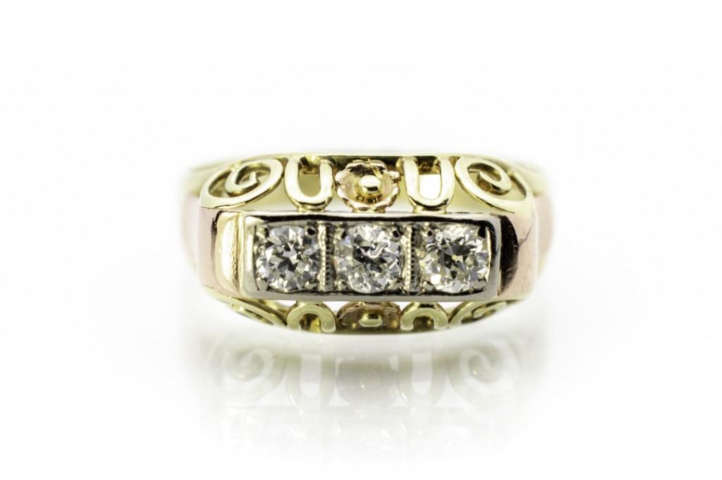 Zlatý prsten o ryzosti 585/1000, punc labuť, velikost 56, váha 3,1g, v nejširším bodě 1 cm, diamanty 3 x 0,2 ct.