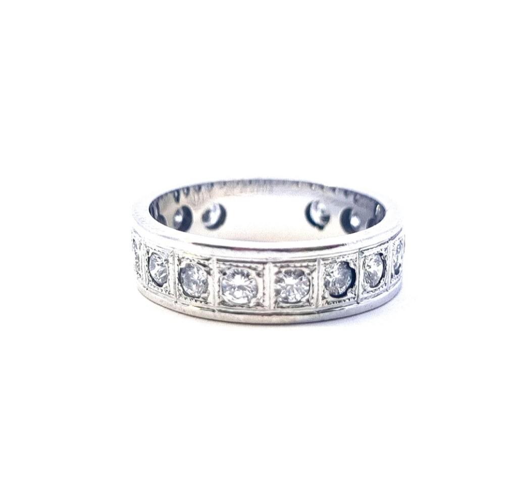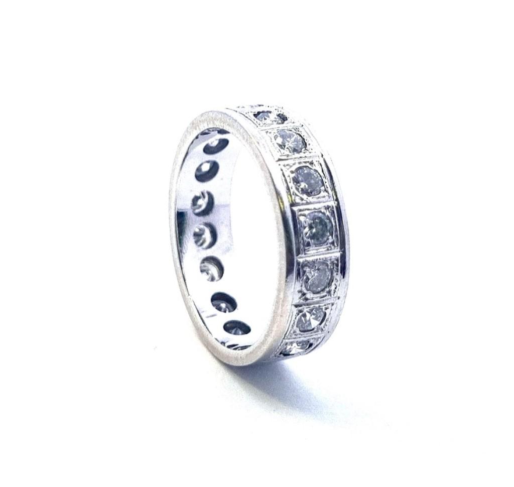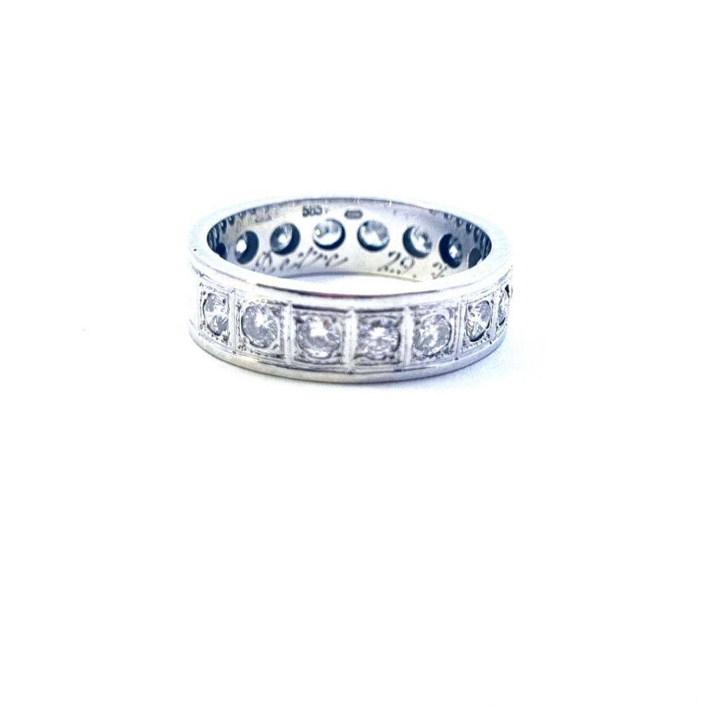 Zlatý prsten o ryzosti 585/1000, punc labuť. Velikosti 55, váha 5,01 g, šířka 5,5 mm. Kámen - diamant briliantového brusu - celkem 16 ks, 0,07 ct, celkem cca 1,10 ct. Uvnitř prstenu nápis.