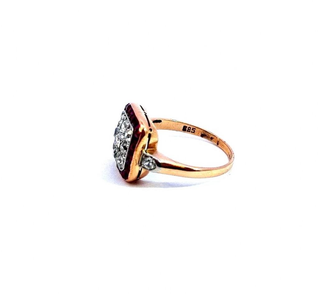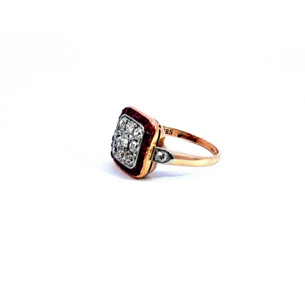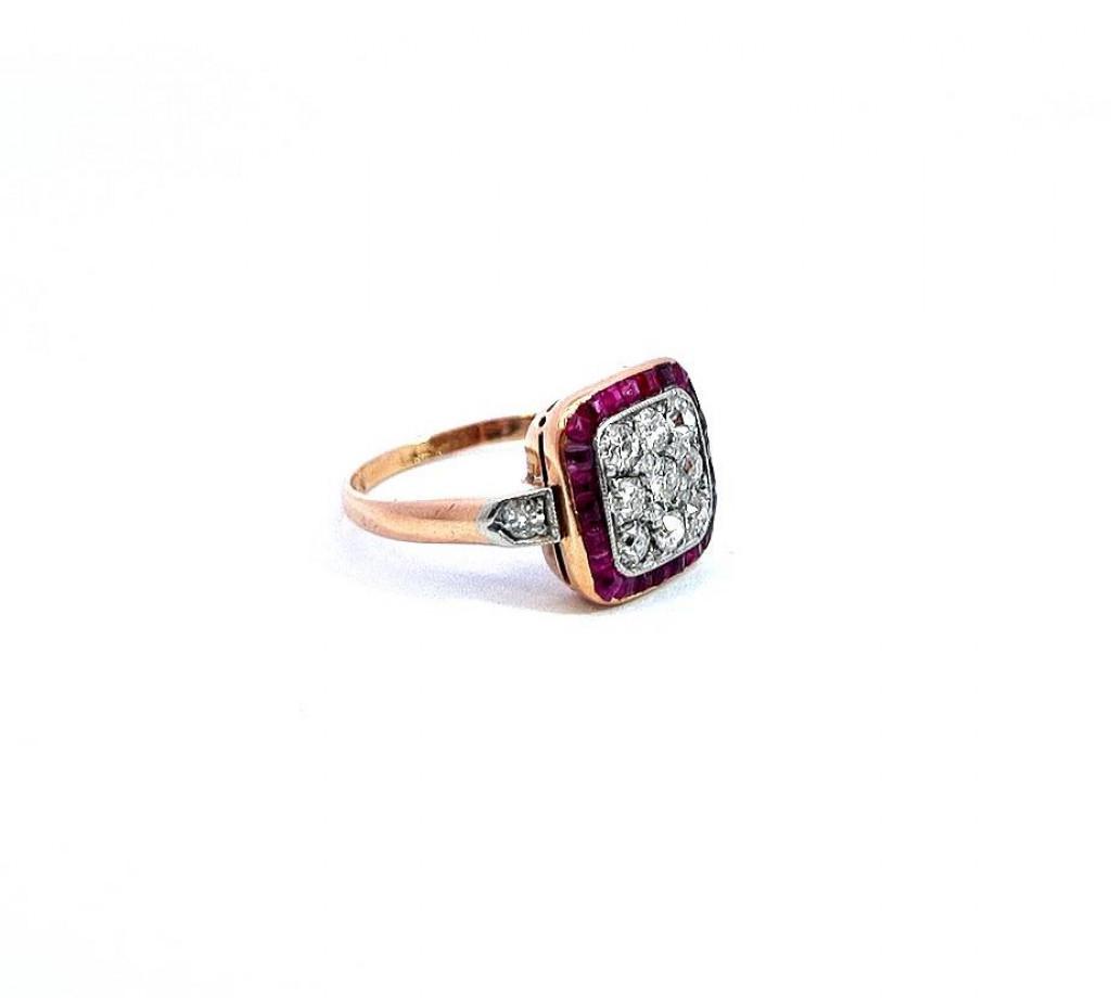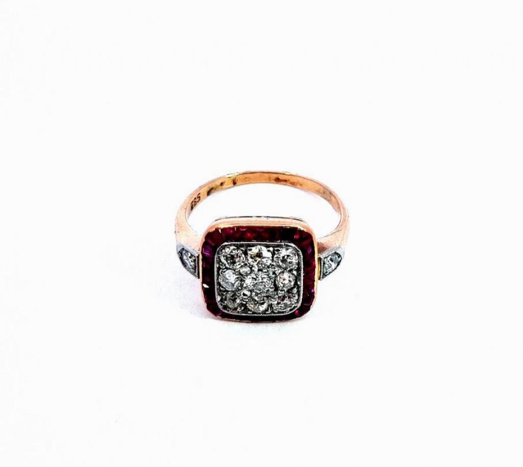 Prsten z růžového zlata o ryzosti 585/1000, punc labuť. Velikost 52, váha 3,79 g, rozměr hlavy prstenu 12 x 12 mm. Kámen - přírodní rubín - 24 ks. Kámen - přírodní diamant staroevropského brusu - 11 ks, hlava prstenu: 9ks, každý kámen cca 0,08 ct, boční kameny: 2 ks, cca 0,05 ct - dohromady cca 0,82 ct, Kámen - přírodní diamant routa - 4 ks.