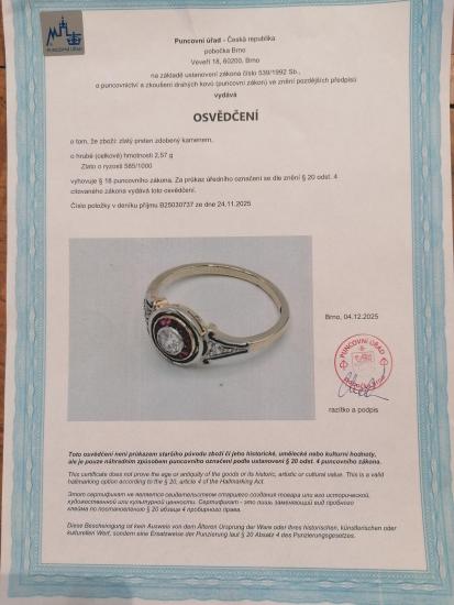 Prsten z kombinace žlutého a bílého zlata o ryzosti 585/1000, osvědčení z PÚ. Velikost 53, váha 2,58 g, v nejširším bodě 8,5 mm. Kámen - syntetický rubín - 16 ks. Kámen - přírodní diamant staroevropského brusu - 3 ks, centrální kámen: 1 ks, cca 0,18 ct, boční kameny: 2 ks, cca 0,02 ct - dohromady cca 0,22 ct.