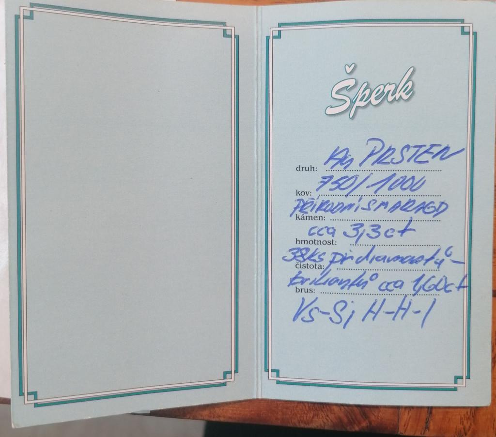 Prsten z bílého zlata o ryzosti 750/1000, punc kohout. Velikost 56, váha 8,08 g, rozměr hlavy prstenu 21 x 17 mm. Kámen - přírodní smaragd - 1 ks, cca 3,3 ct. Kámen - přírodní diamant briliantového brusu - celkem 38 ks, cca 1,60 ct, čistota: VS - SI, barva: H - H - I.