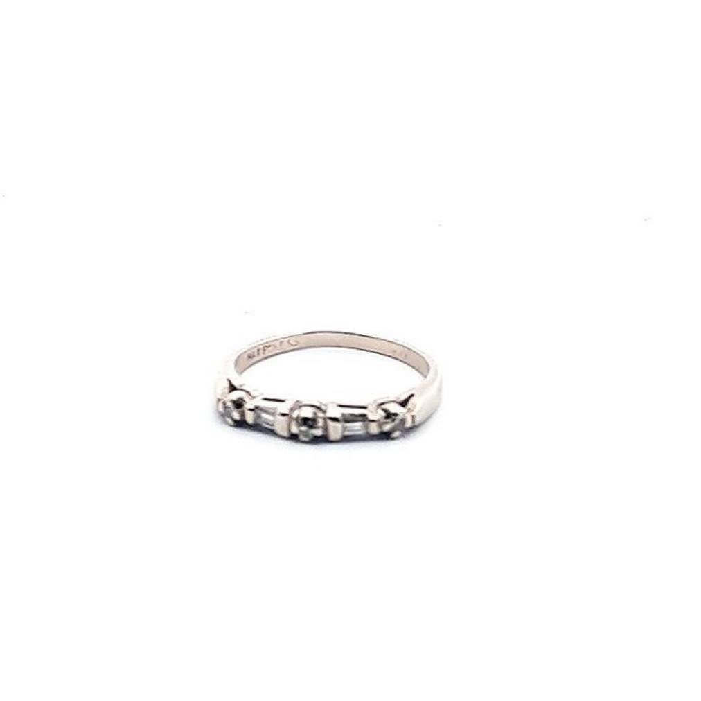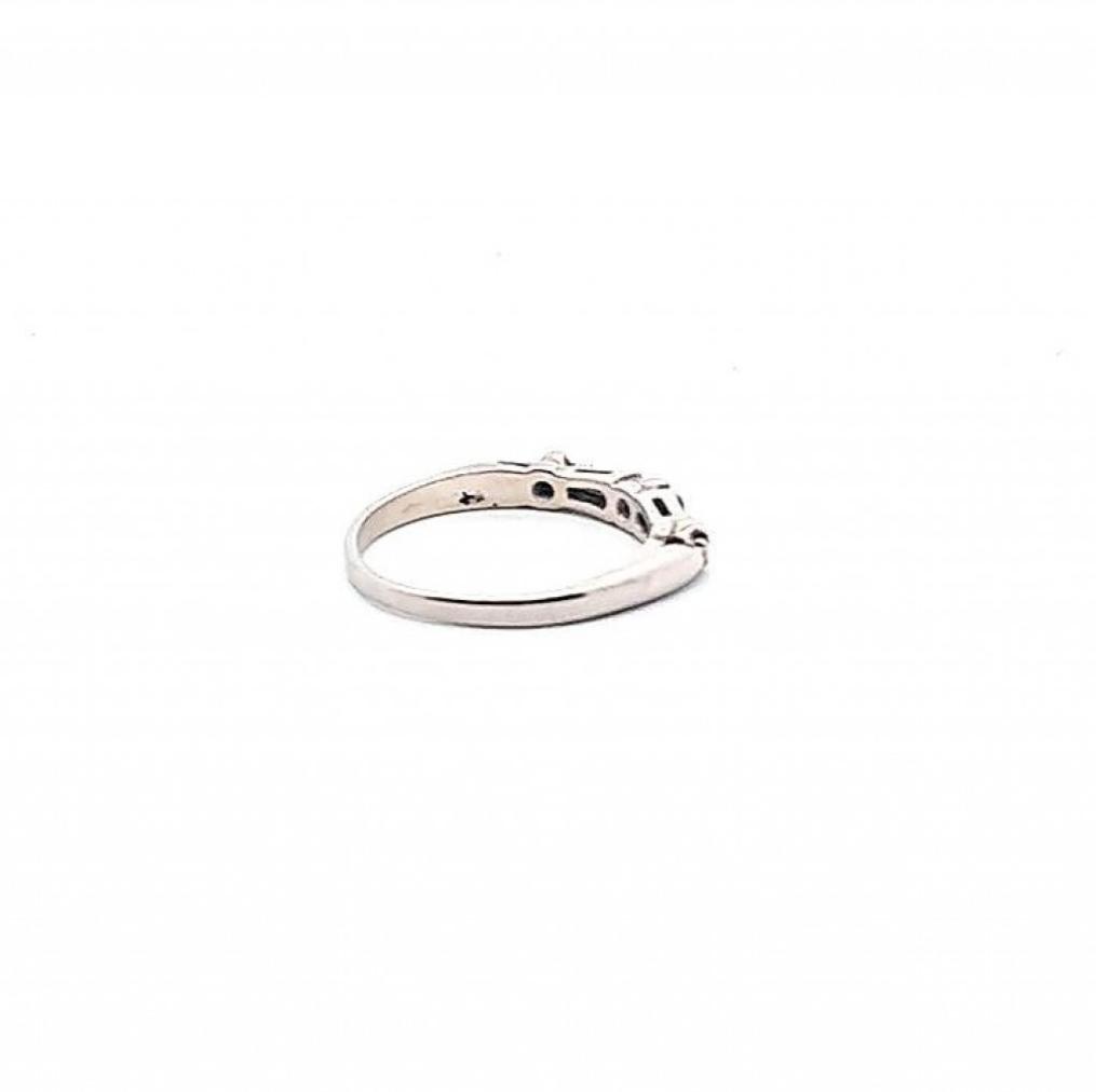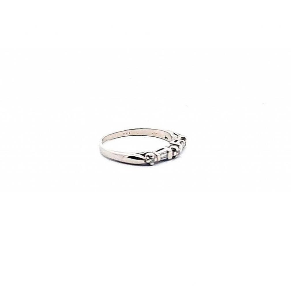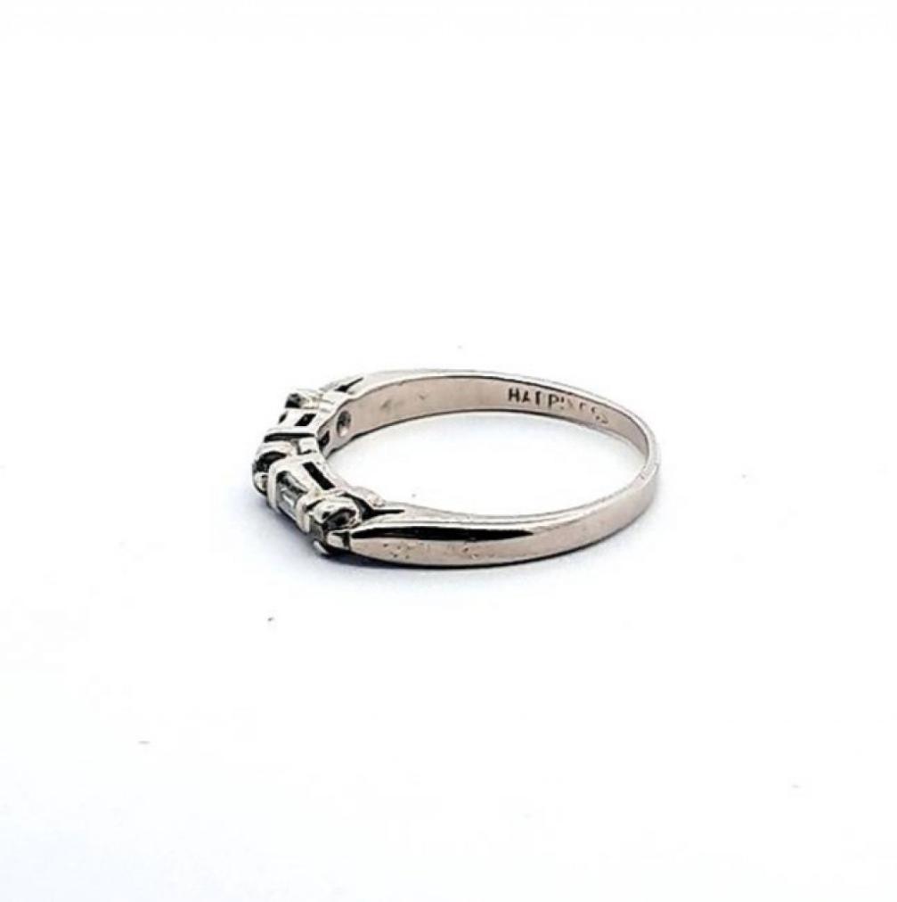Prsten z bílého zlata o ryzosti 585/1000, punc labuť. Velikost 52, váha 2,20 g, v nejširším bodě 3 mm. Kámen - přírodní diamant briliantového brusu - 3 ks, cca 0,01 ct - dohromady cca 0,03 ct. Kámen - přírodní diamant brusu baguette - 2 ks.