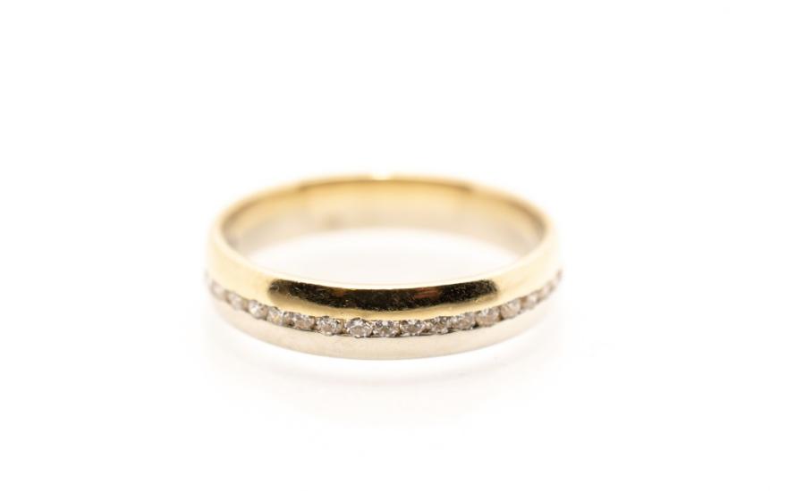 Zlatý prsten o ryzosti 585/1000, punc labuť, váha 2,85 g, velikost 53, v nejširším bodě 4 mm, kámen - diamant, celkem 22 kusu, cca 0,22ct