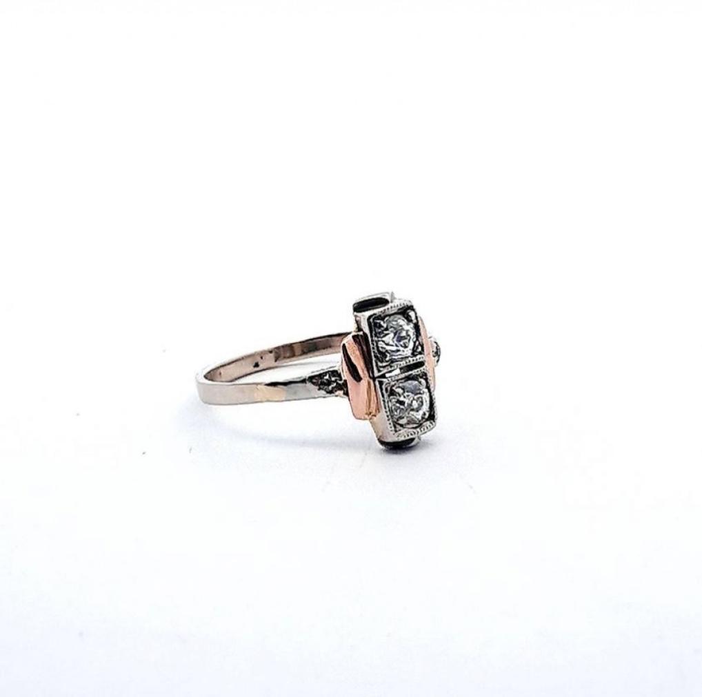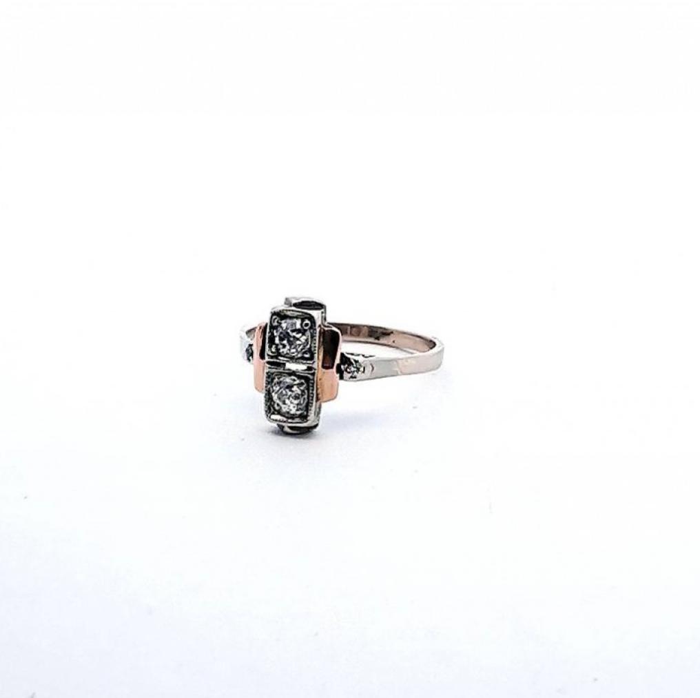 Prsten z bílého a růžového zlata o ryzosti 585/1000, punc labuť. Velikost 53, váha 2,09 g, v nejširším bodě 12 mm. Kámen - přírodní diamant staroevropského brusu - 2 ks, menší kámen cca 0,10 ct, větší kámen cca 0,15 ct - dohromady cca 0,25 ct. Kámen - přírodní diamant routa - 2 ks.