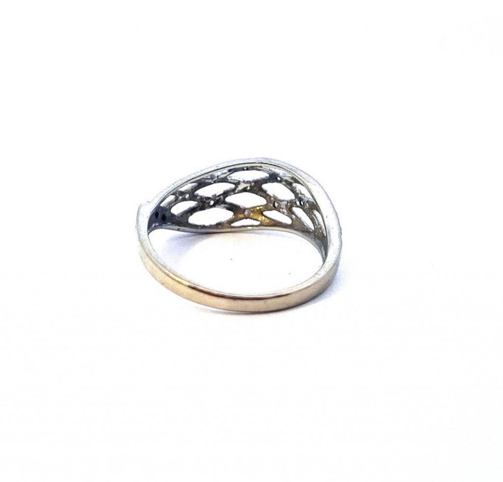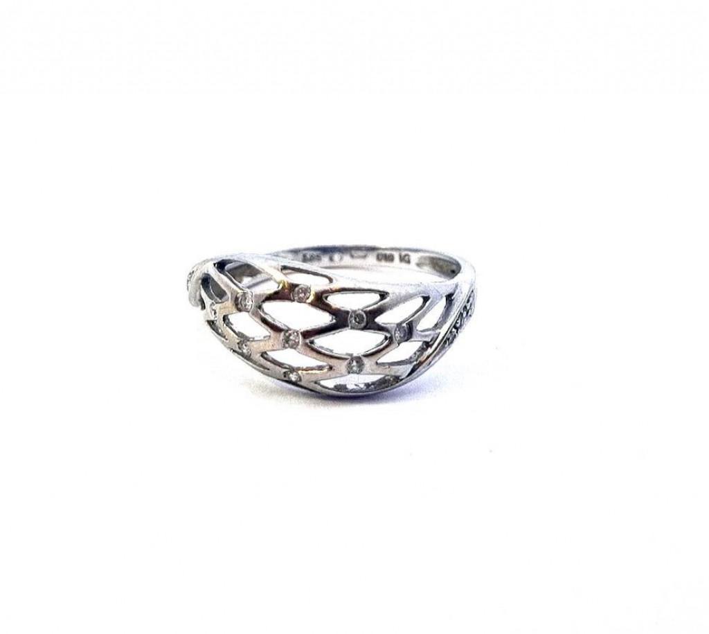 Prsten z bílého zlata o ryzosti 585/1000, punc labuť. Velikost 56, váha 2,38 g, v nejširším bodě 9 mm. Kámen - přírodní diamant briliantového brusu - celkem 13 ks, dohromady cca 0,10 ct.
