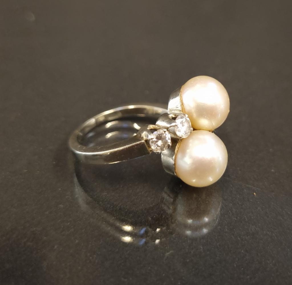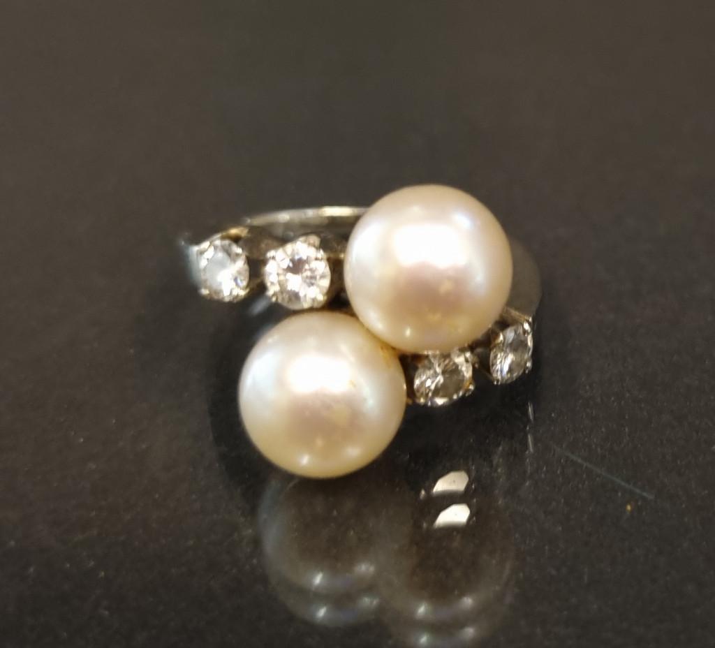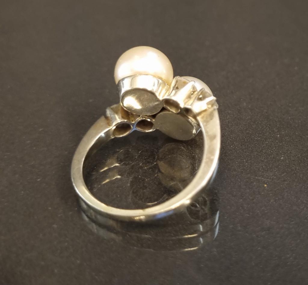 Prsten z bílého zlata o ryzosti 585/1000, punc labuť. Velikost 54, váha 6,31 g, v nejširším bodě 17 mm, průměr perly 8,7 mm. Perly - pěstované perly velmi dobré kvality. Kámen - přírodní diamant briliantového brusu - celkem 4 ks, cca 0,13 ct každý - dohromady cca 0,52 ct, kvalita velmi dobrá. K prstenu je znalecký posudek od gemologa.