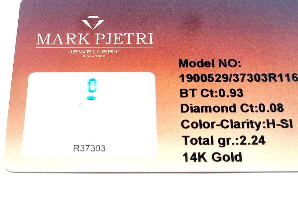 Zlatý prsten s topazem a diamanty, 0,08 ct, H-SI, vel. 54, ryzost 585/1000, punc labuť. Váha 2,37 g.