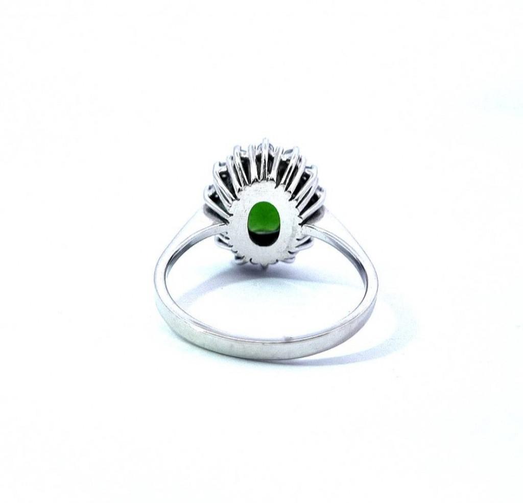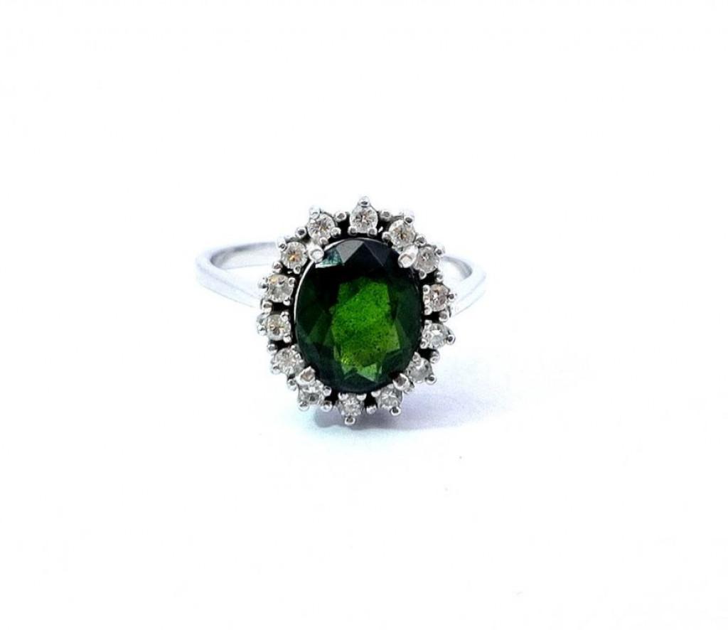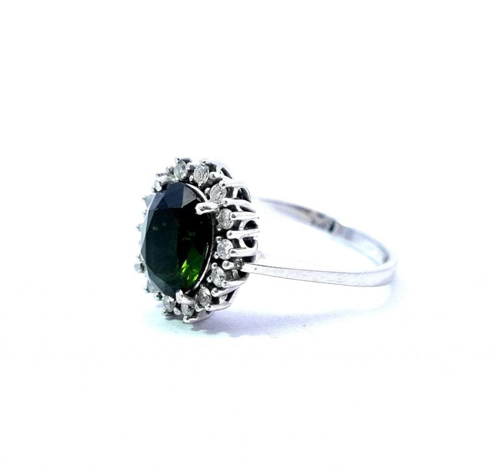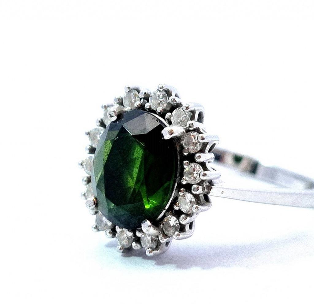 Zlatý prsten z bílého zlata o ryzosti 585/1000, punc labuť, váha 5,70 g, velikost 59, v nejširším bodě 15 mm. Kámen - přírodní turmalín verdelit - 1 ks. Kámen - přírodní diamant briliantového brusu - celkem 14 ks, cca 0,02 ct každý. Dohromady cca 0,28 ct.
