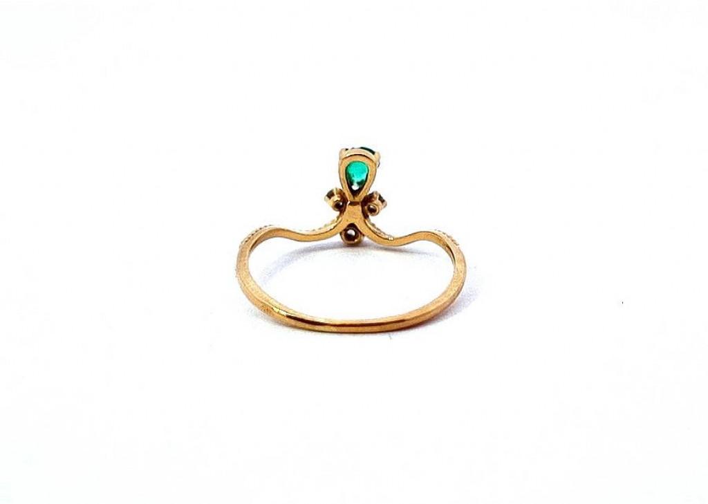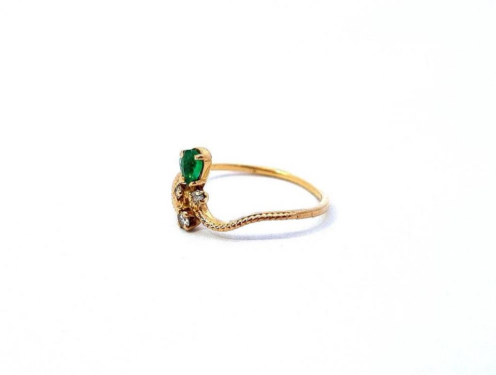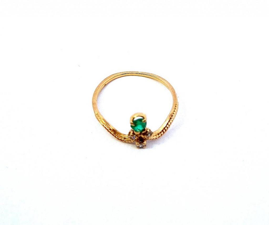 Zlatý prsten o ryzosti 750/1000, punc kohout. Velikost 49, váha 1,15 g, v nejširším bodě 9 mm. Kámen - přírodní smaragd - 1 ks. Kámen - přírodní diamant briliantového brusu - 3 ks, celkem cca 0,07 ct. Smaragd má malý oťuk.