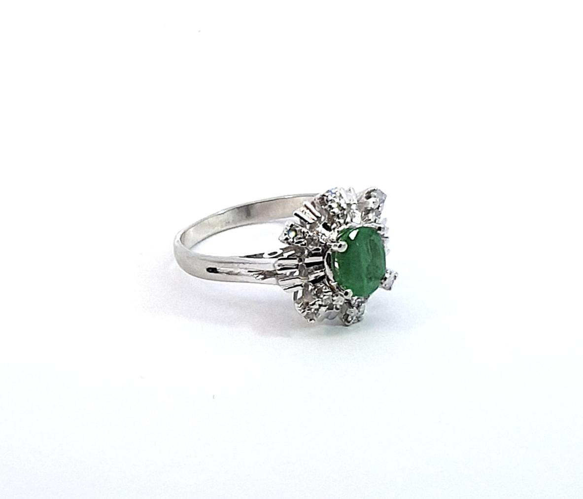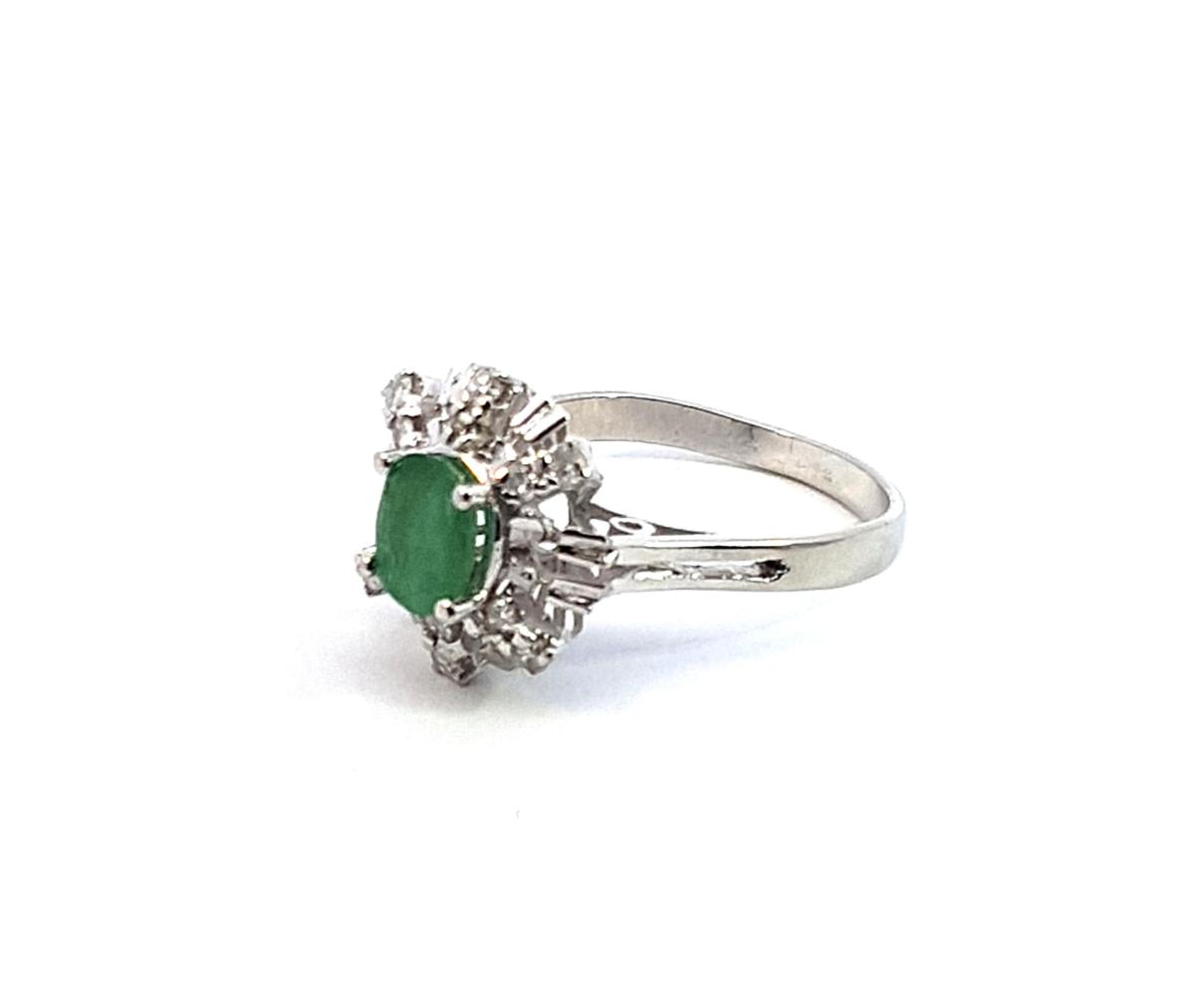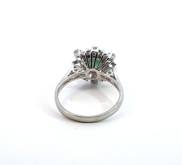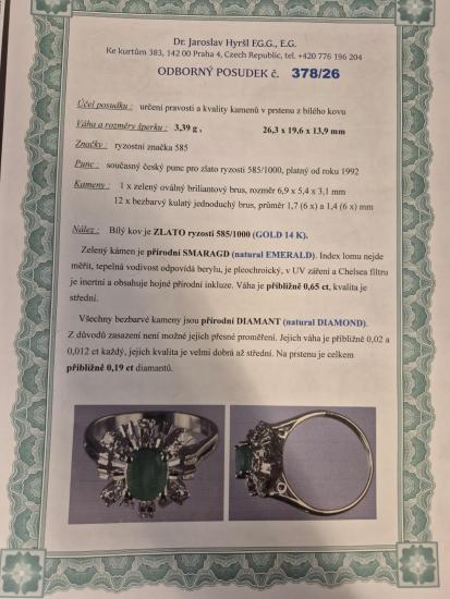 Prsten z bílého zlata o ryzosti 585/1000, punclabuť Velikost 54, váha 3,40 g, rozměr ozdoby 14 x 13,5 mm. Kámen - přírodní smaragd - 1 ks, cca 0,65 ct. Kámen - přírodní diamant, celkem cca 0,19 ct.