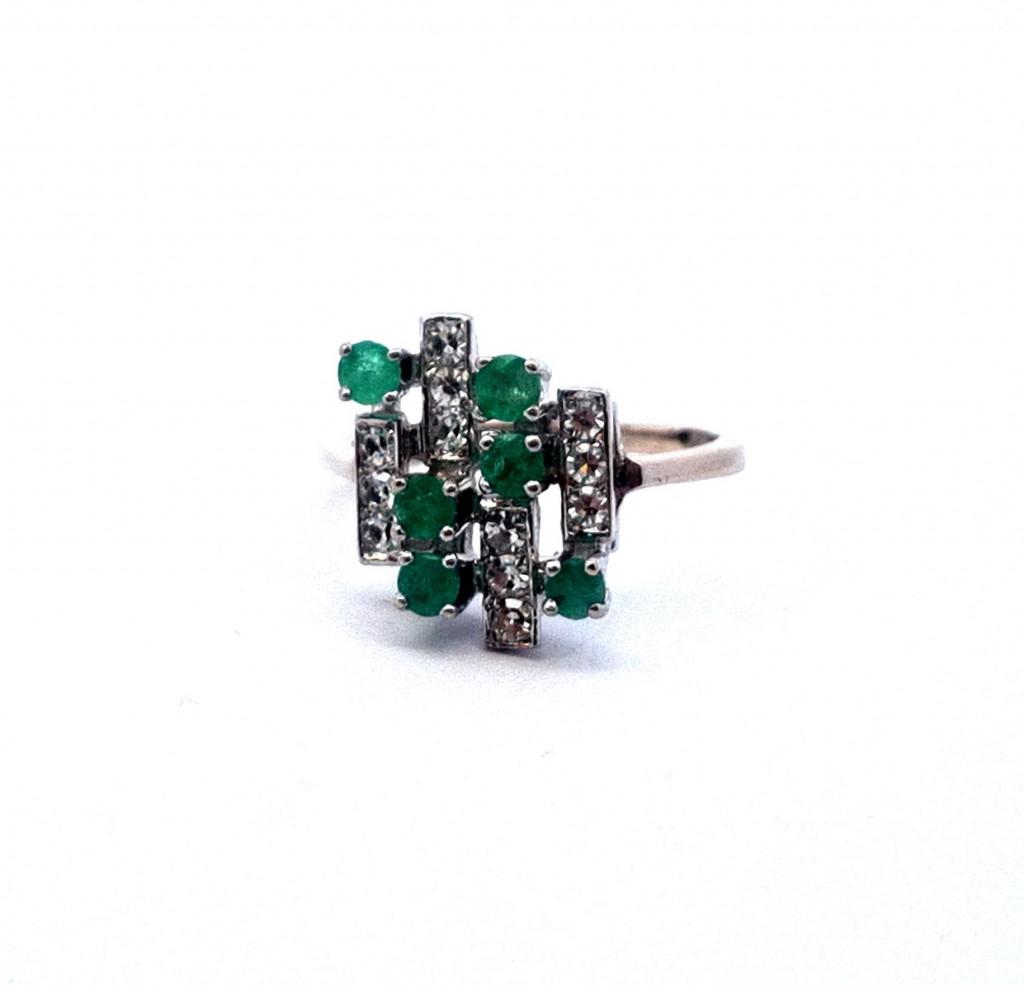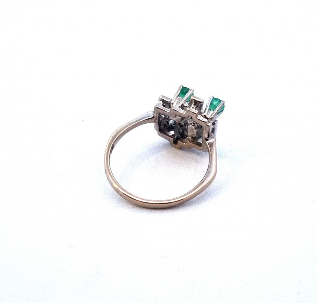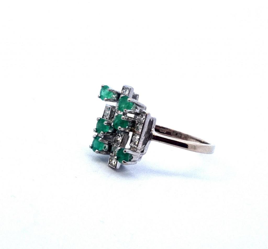 Prsten z bílého zlata o ryzosti 585/1000, punc labuť. Velikost 53, váha 3,61 g, v nejširším bodě 15 mm. Kámen - přírodní smaragd - 6 ks, cca 0,07 ct každý - dohromady cca 0,42 ct. Kámen - diamant briliantového brusu - 12 ks, cca 0,04 ct každý - dohromady cca 0,48 ct.