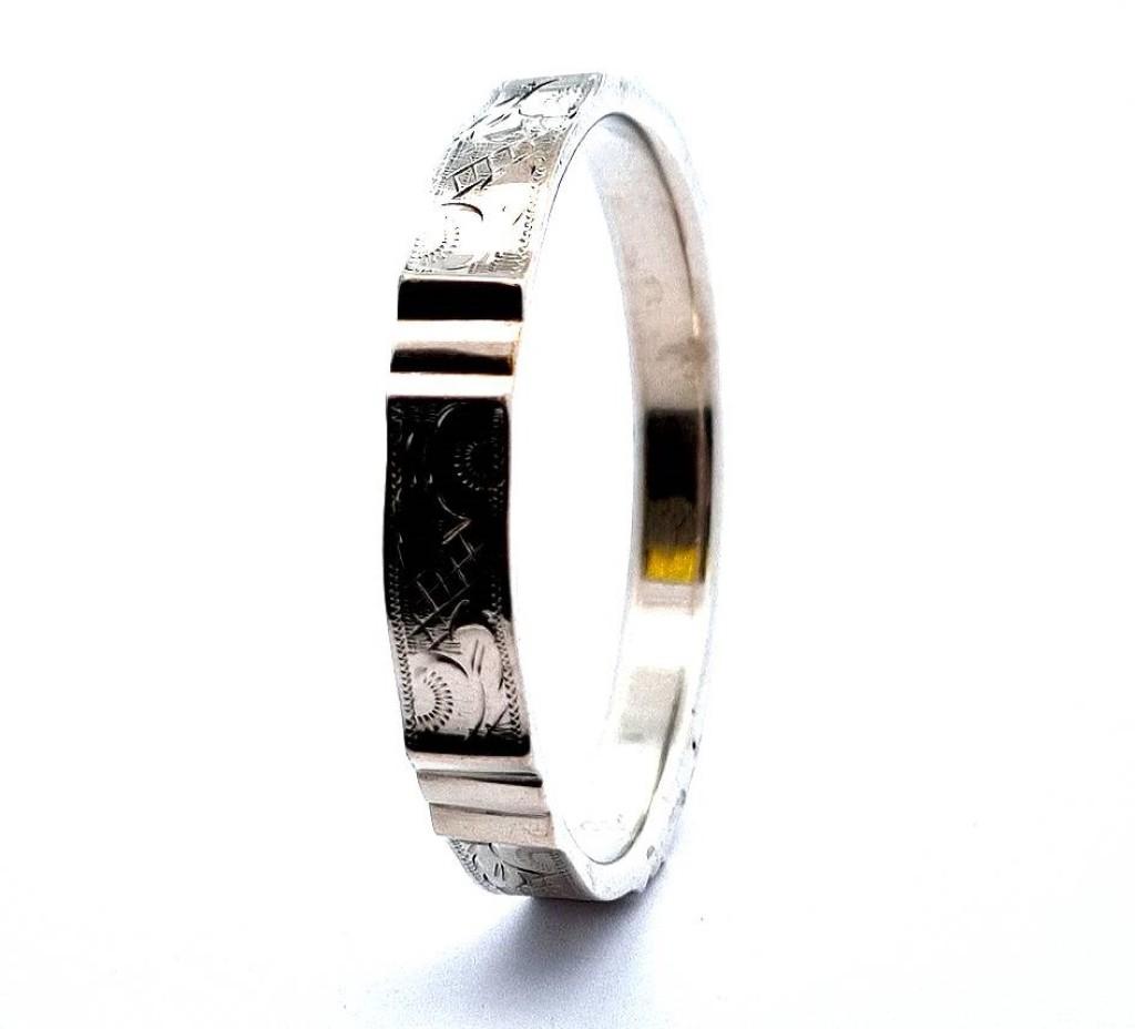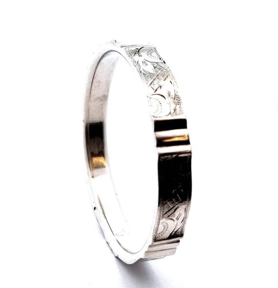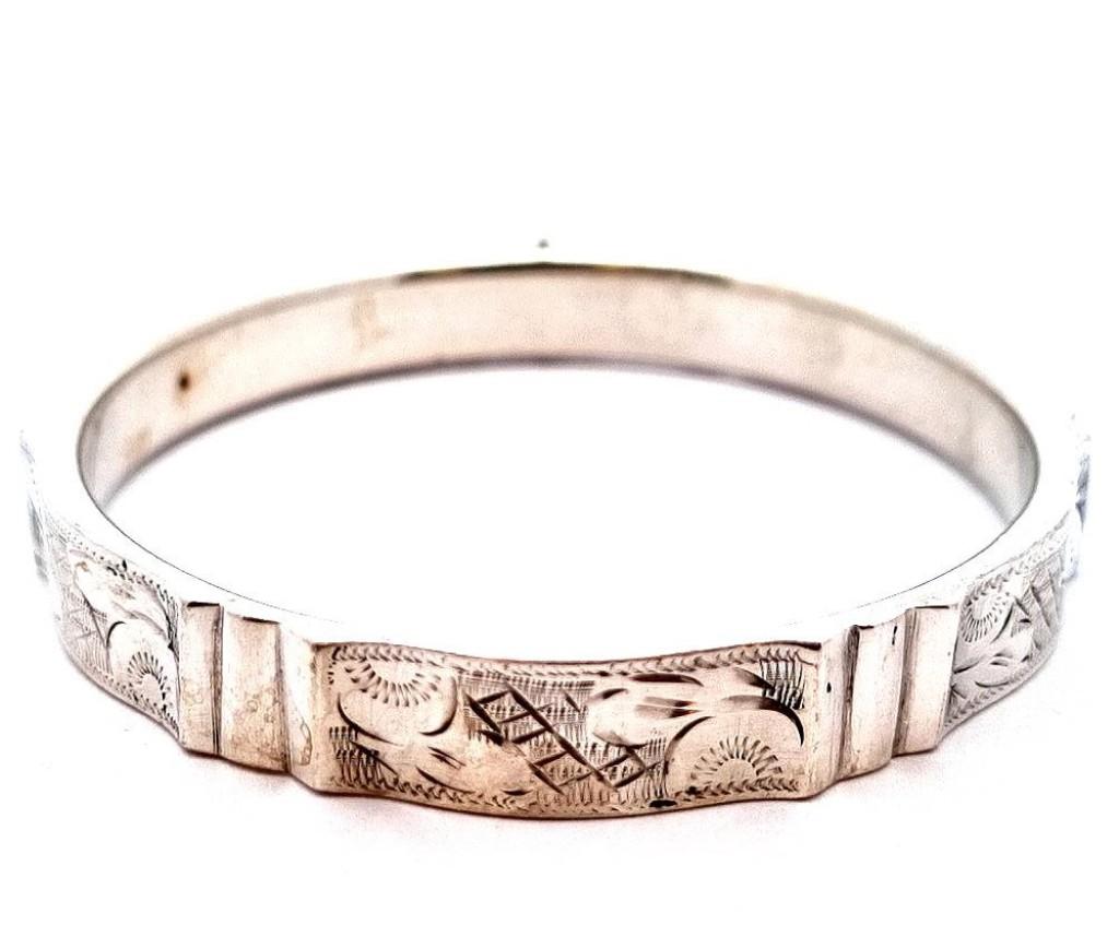 Stříbrný náramek o ryzosti 835/1000, platný punc. Váha 21,44 g, vnitřní průměr 66 mm, šířka 10,5 cm.