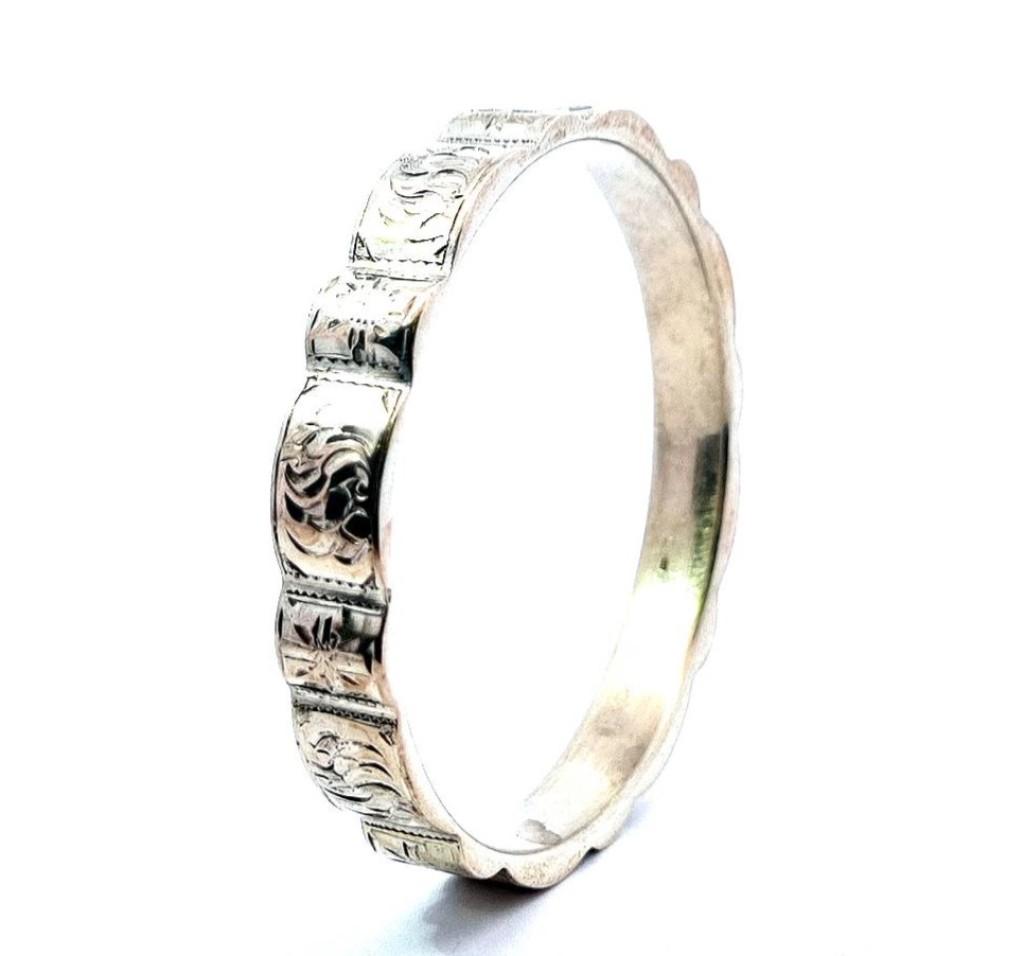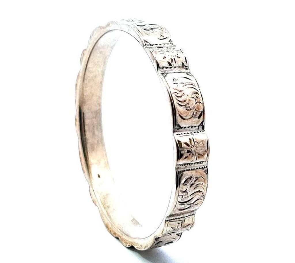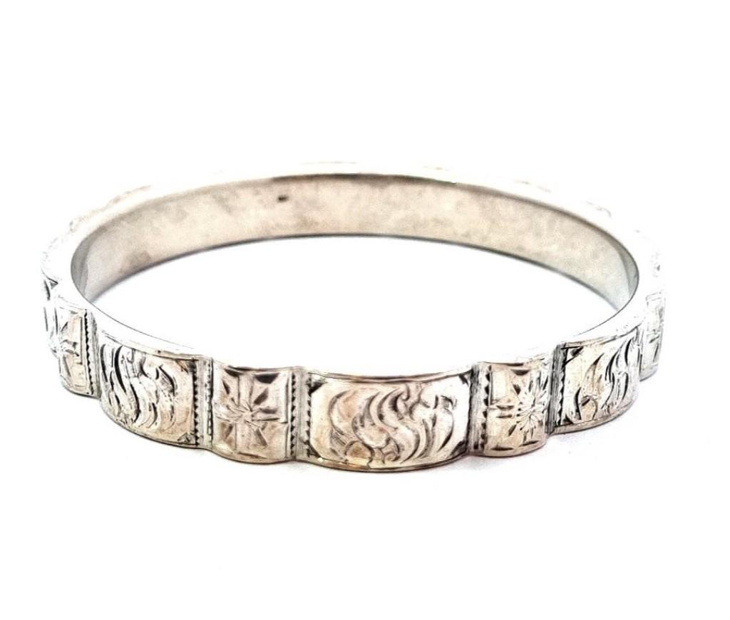 Stříbrný náramek o ryzosti 835/1000, platná puncovní značka. Váha 22,54 g, vnitřní průměr 66 mm, šířka 10,5 mm.