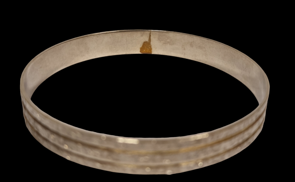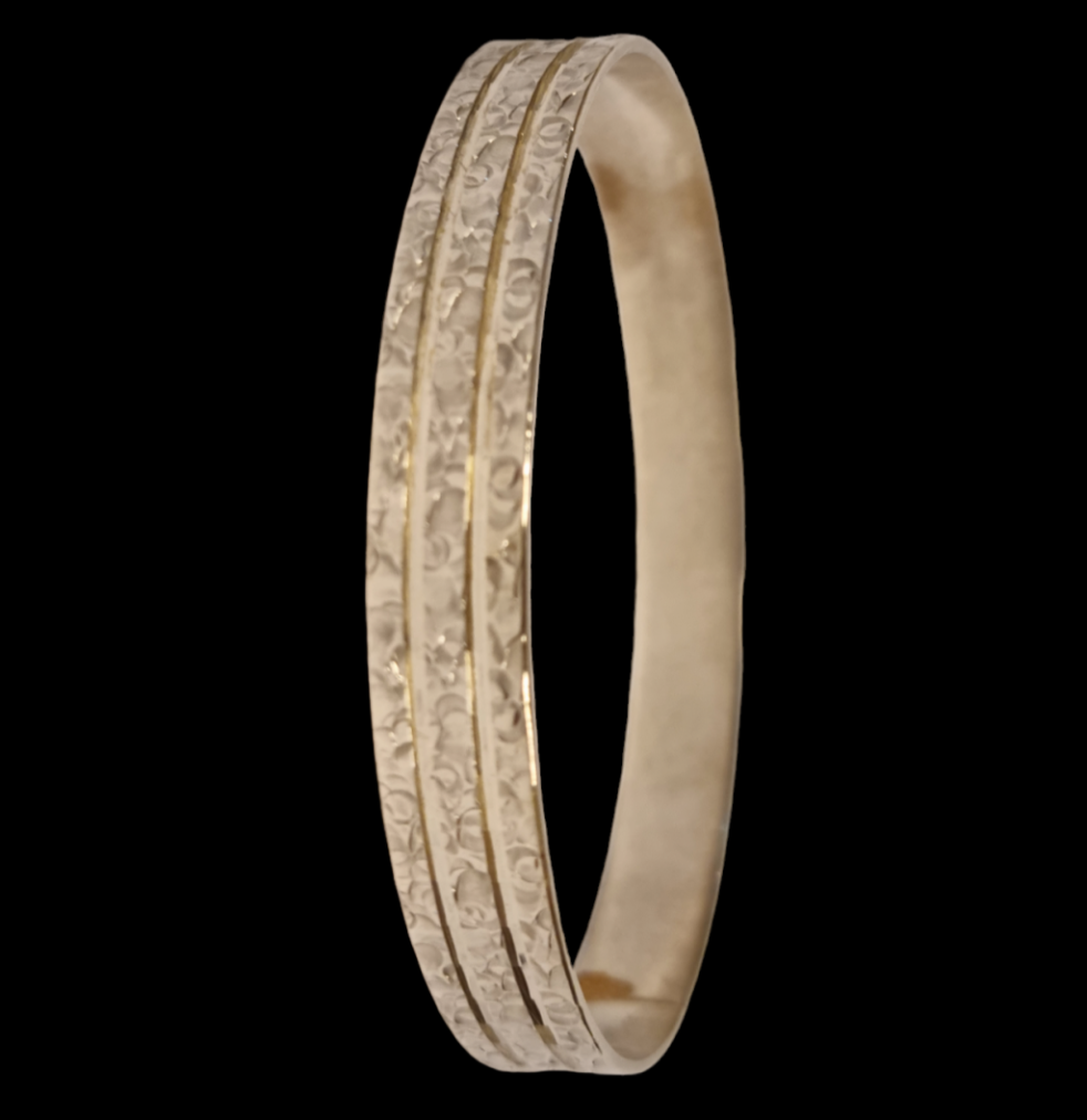 Stříbrný náramek o ryzosti 900/1000, punc zajíc. Váha 18,10 g, vnitřní průměr 65 mm, šířka 9 mm.
