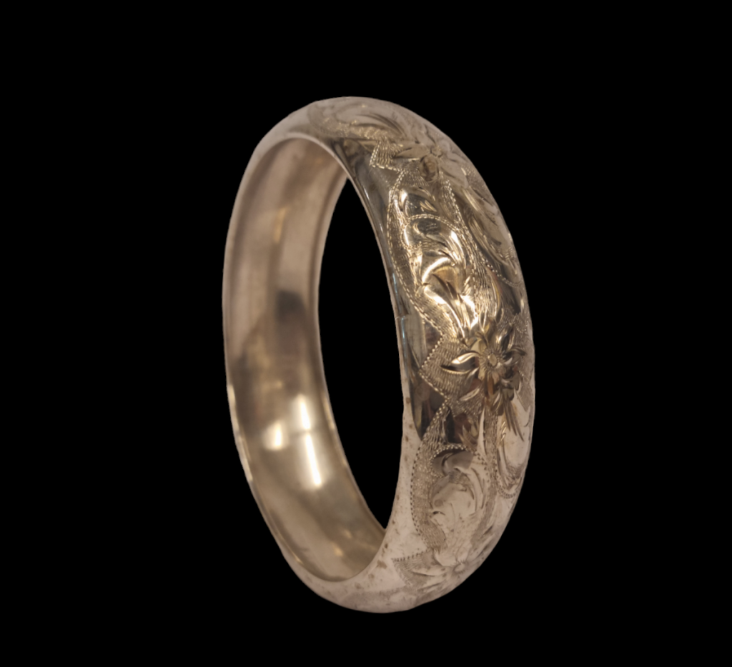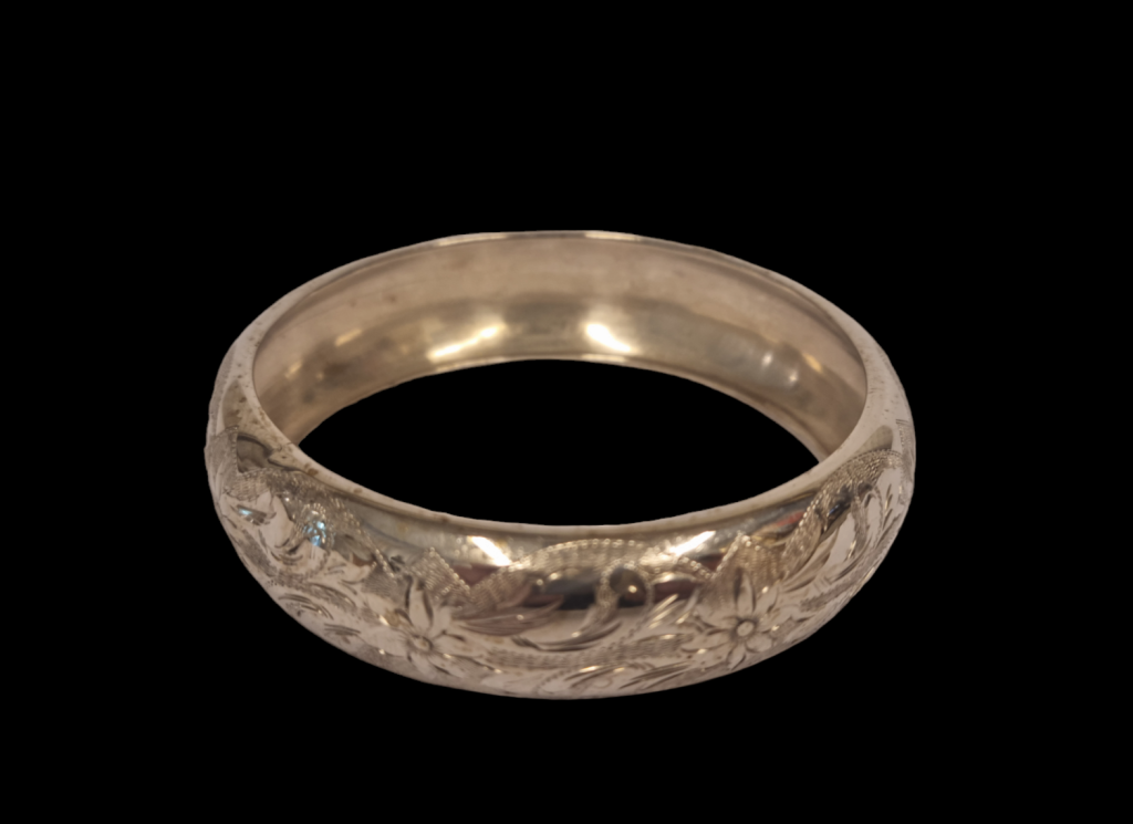 Stříbrný náramek o ryzosti 900/1000, platná puncovní značka. Váha 24,62 g, vnitřní průměr 67 mm, šířka 19 mm.