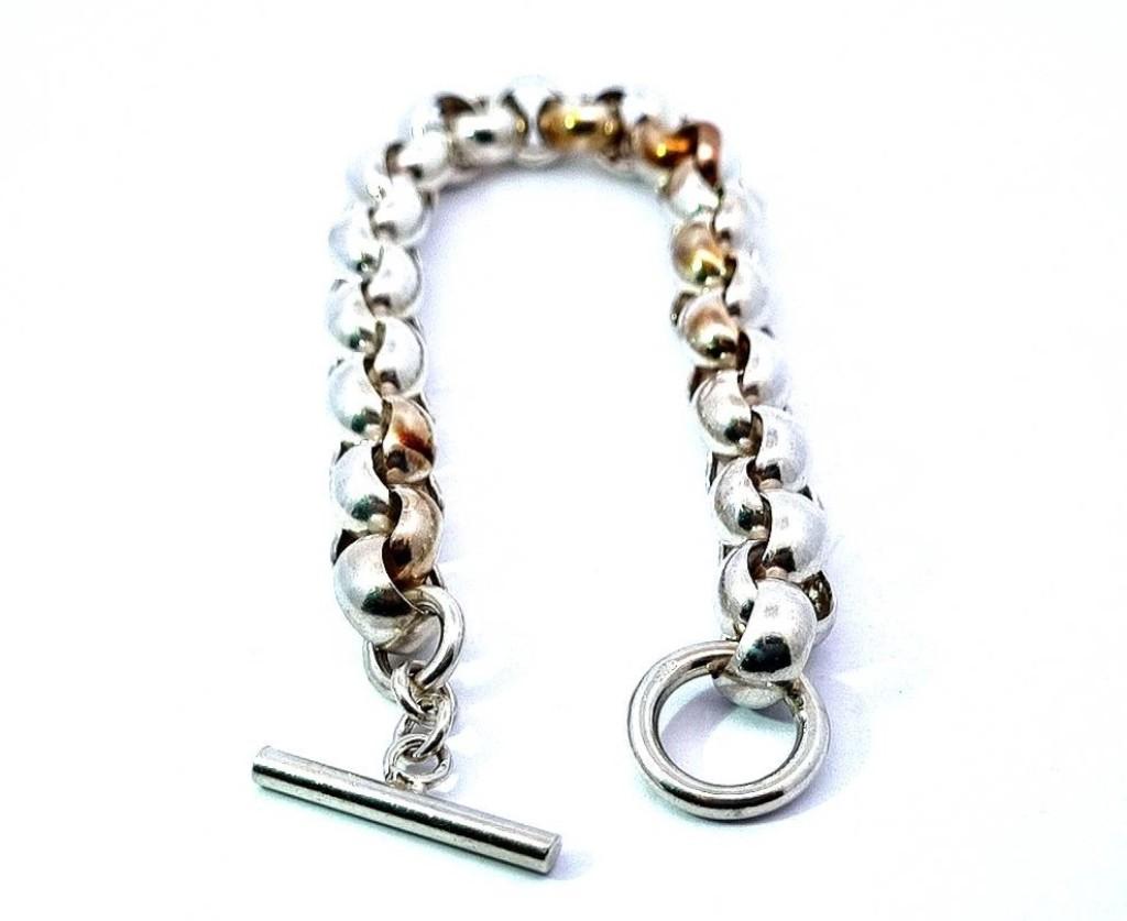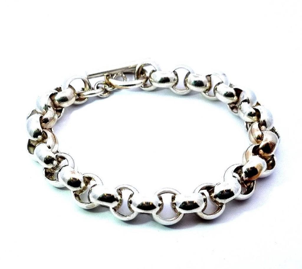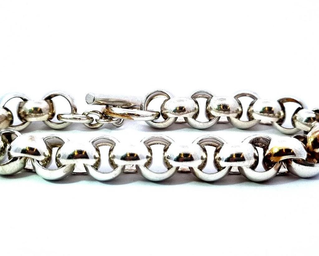 Stříbrný náramek o ryzosti 925/1000, punc kamzík. Váha 30,93 g, délka 18,8 cm, šířka 10 mm.